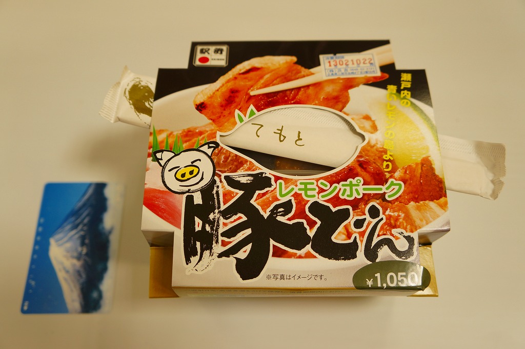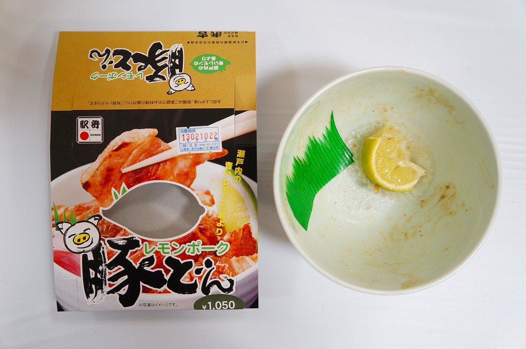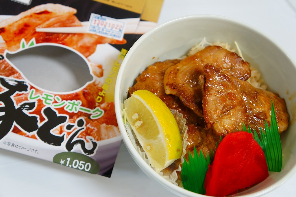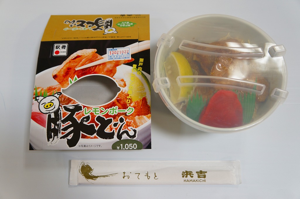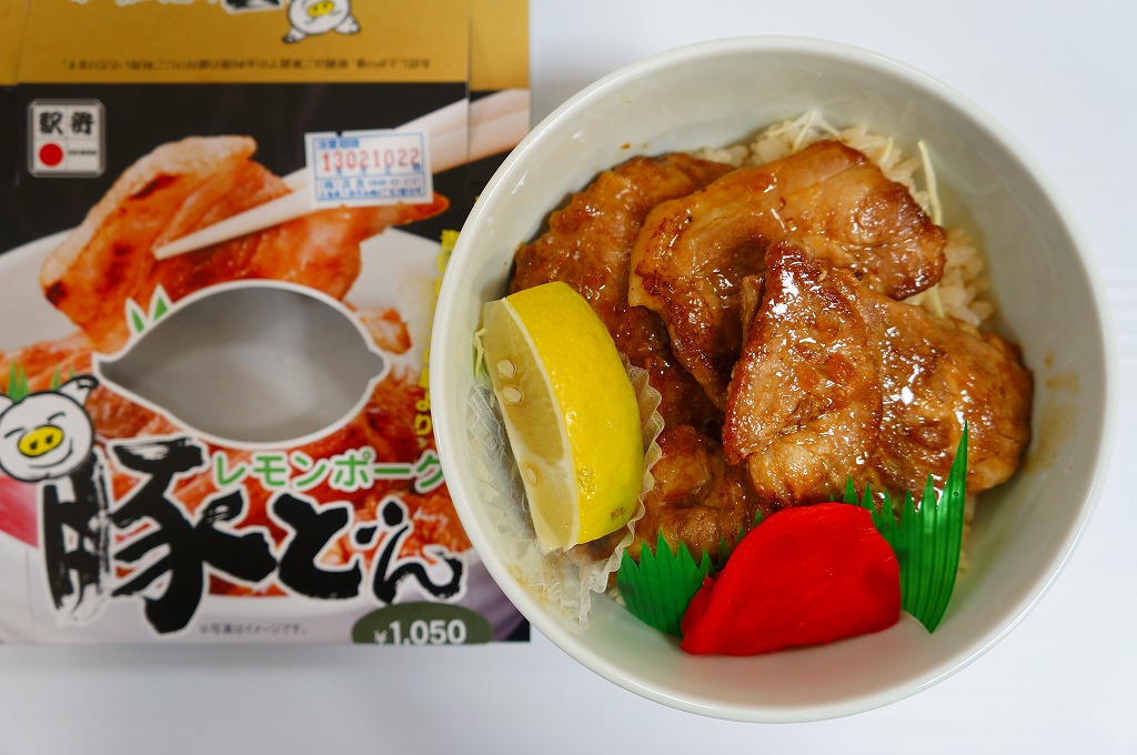 白い器に茶飯を詰め、レモンソースに漬けた豚焼肉を貼り、レモンと紅生姜を添える。味は良好、見栄えはもっと良好な豚丼であるが、どうもこれはこの2013年の鶴屋での駅弁大会でのみ販売された疑義駅弁である模様。