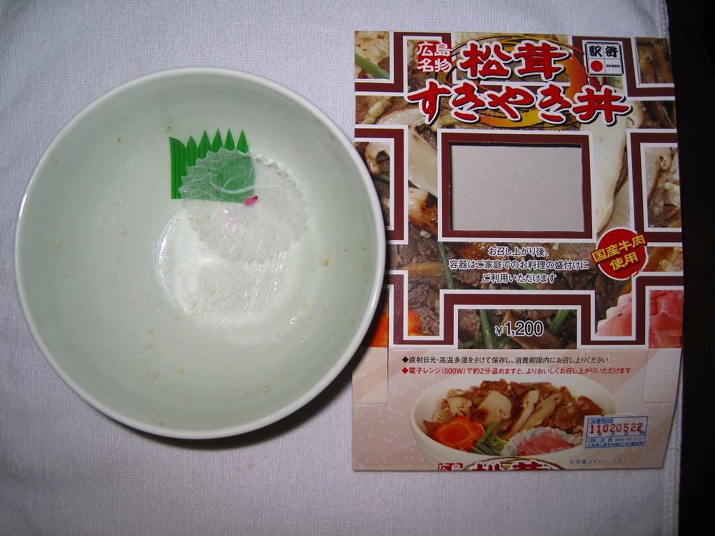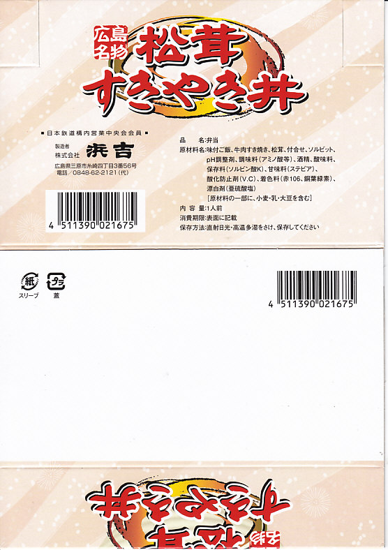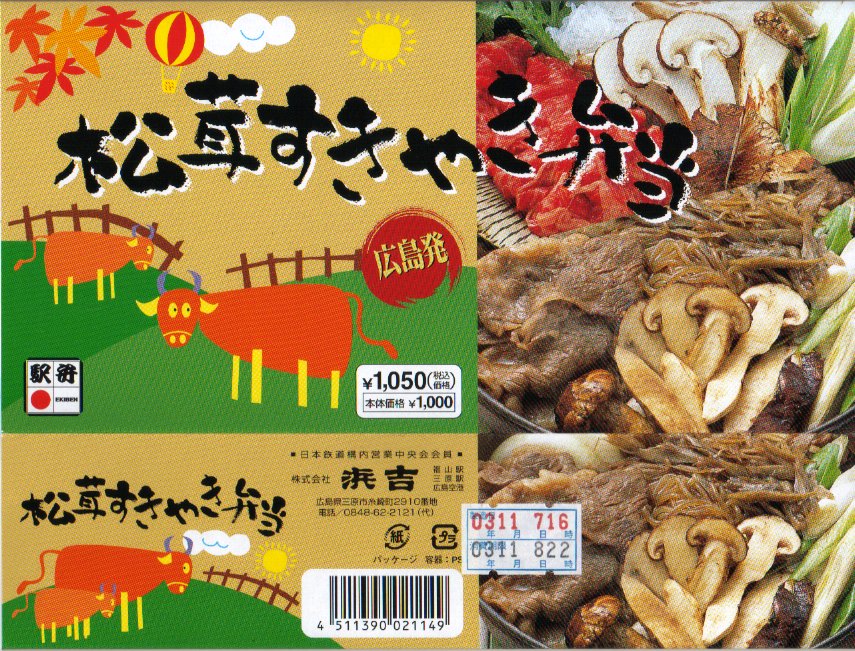 つまり、福山駅の駅弁「松茸すきやき弁当」からマツタケを抜いた廉価版。あるいは空弁向け商品か。神戸で40年の歴史を刻む名駅弁と同じ名前のを選択したのは、おそらく不利に働くだろう。駅や空港で実際に売られているかどうかは不明。現在は売られていない模様。