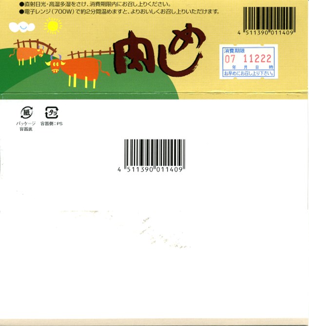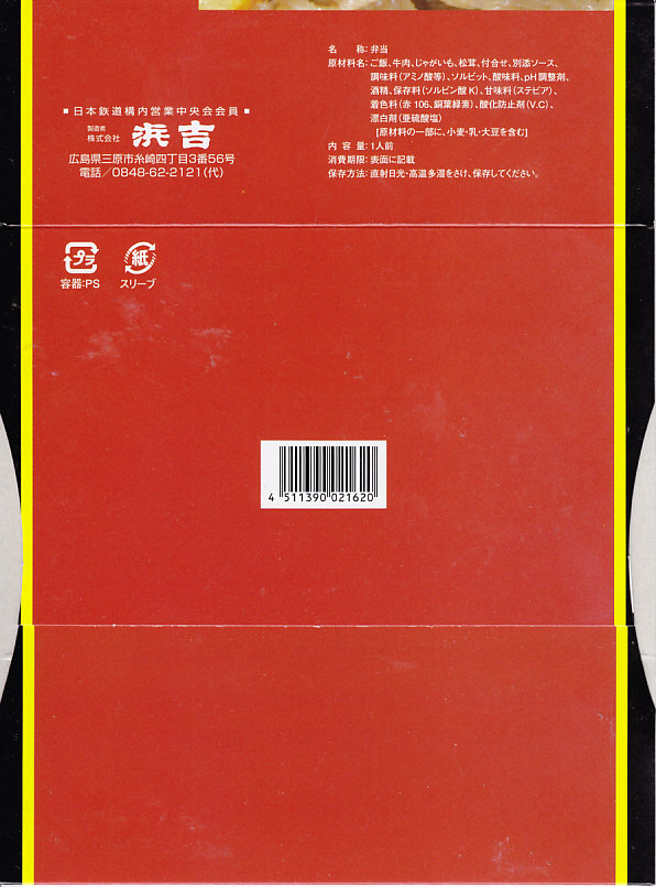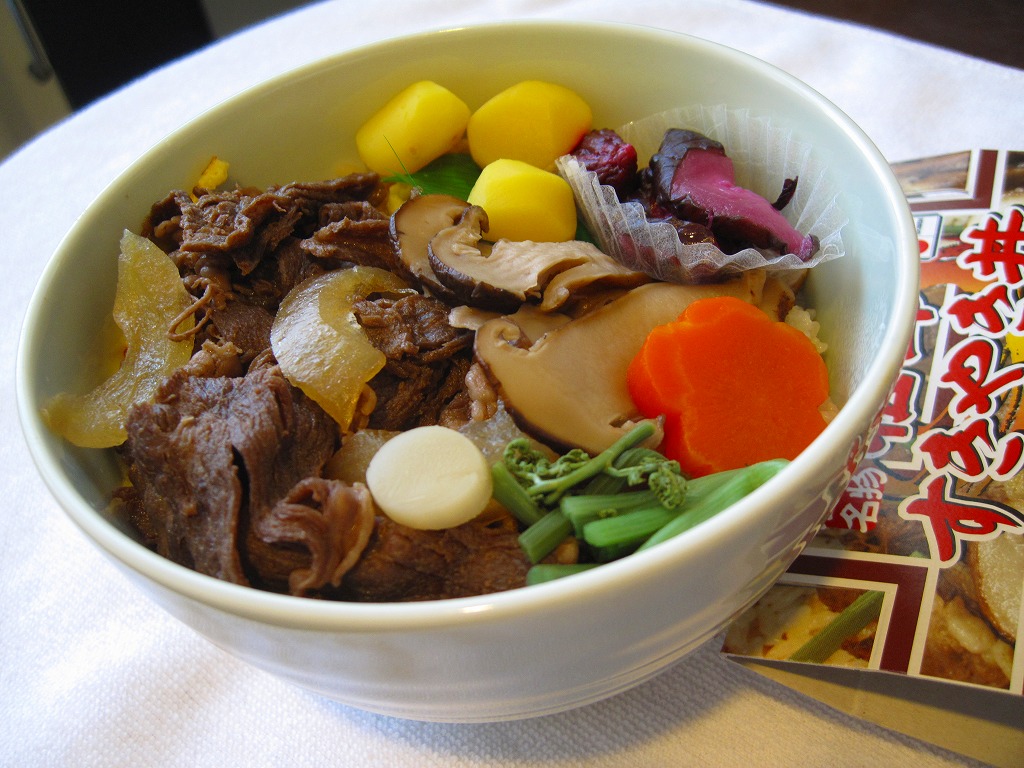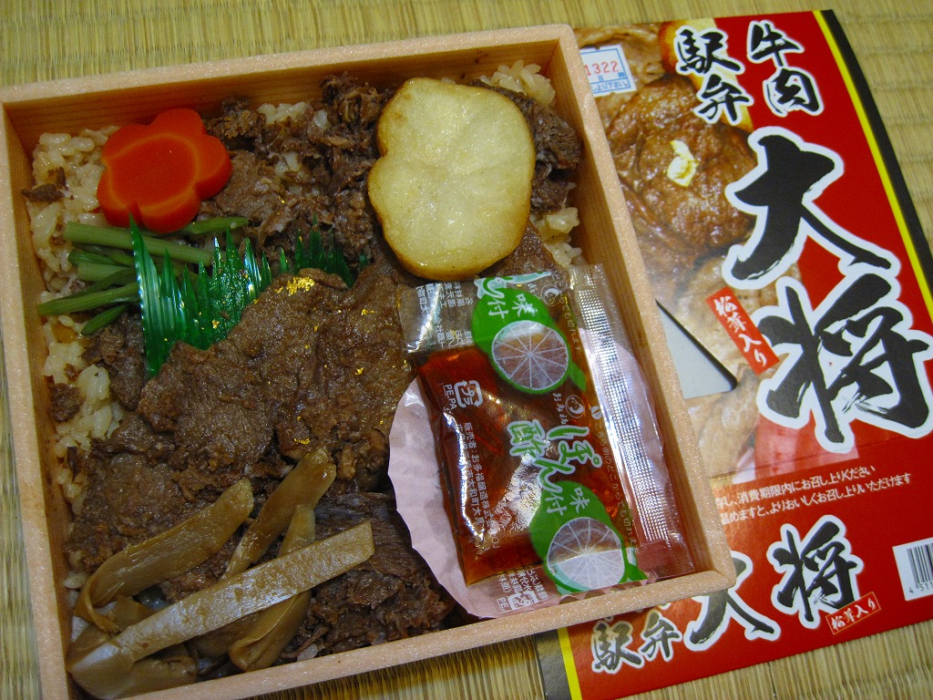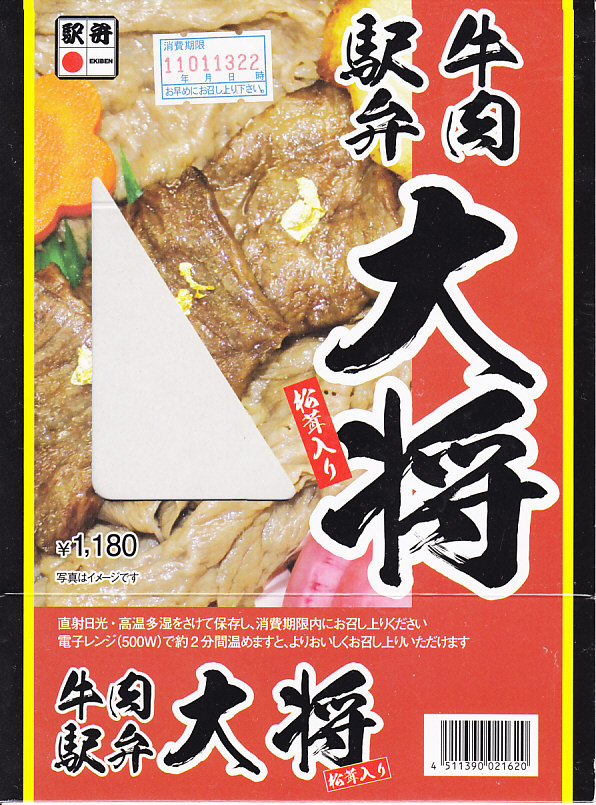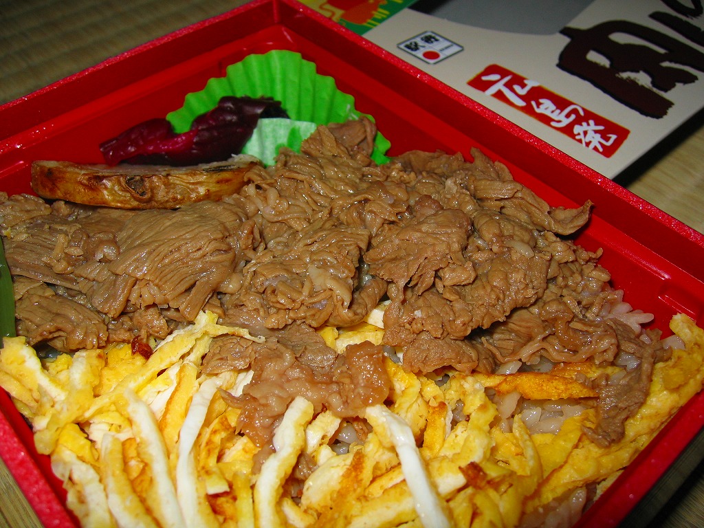 秋冬の駅弁大会シーズンに向けた、2006(平成18)年秋の新商品か。小ぶりな長方形の赤い黒塗りの容器に透明なふたをして、駅弁の名前を書いたボール紙枠にはめる。中身は味付飯の上に牛肉旨煮と刻み玉子焼を敷き、ポテトと山菜と柴漬けを添える。