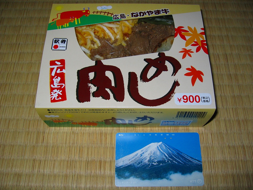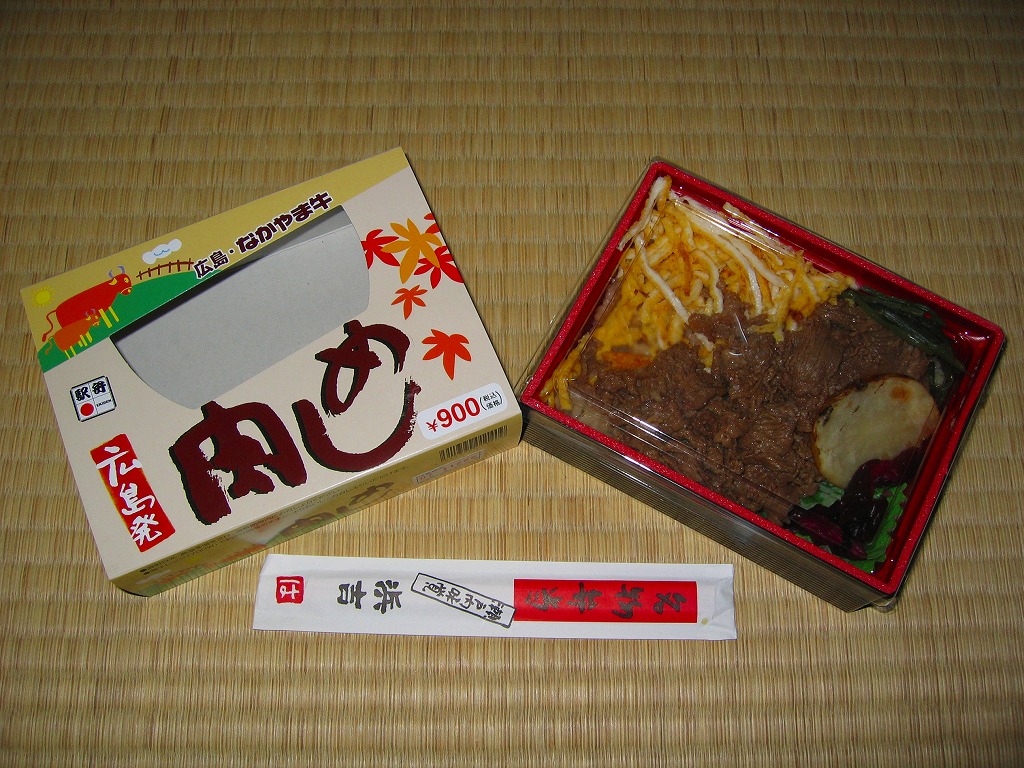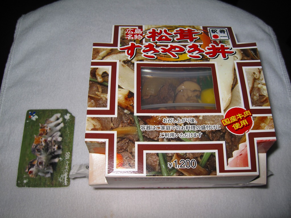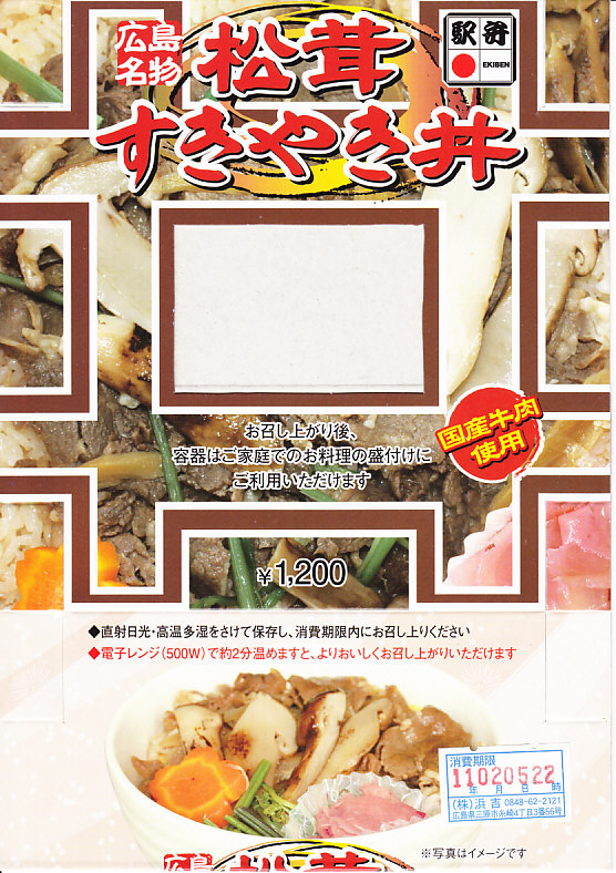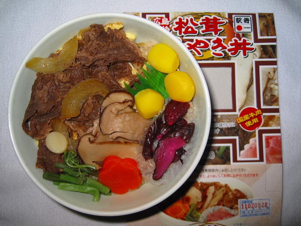 2009(平成21)年か、それ以前に発売か。正方形の小さな容器に透明なふたをして、中身の写真と駅弁の名前を大きく印刷したボール紙の枠にはめる。中身は茶飯の上に牛肉を敷き詰め、ジャガイモ、マツタケ、ニンジン、大根桜漬などとポン酢の袋を添えるもの。添付の味付ぽん酢がこの駅弁の個性や特徴であるのかもしれないが、これを使い忘れたため、内容も味もいつもの三原駅弁。