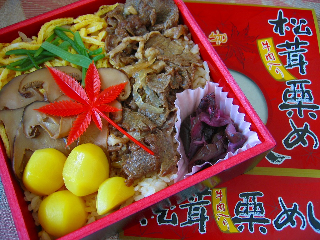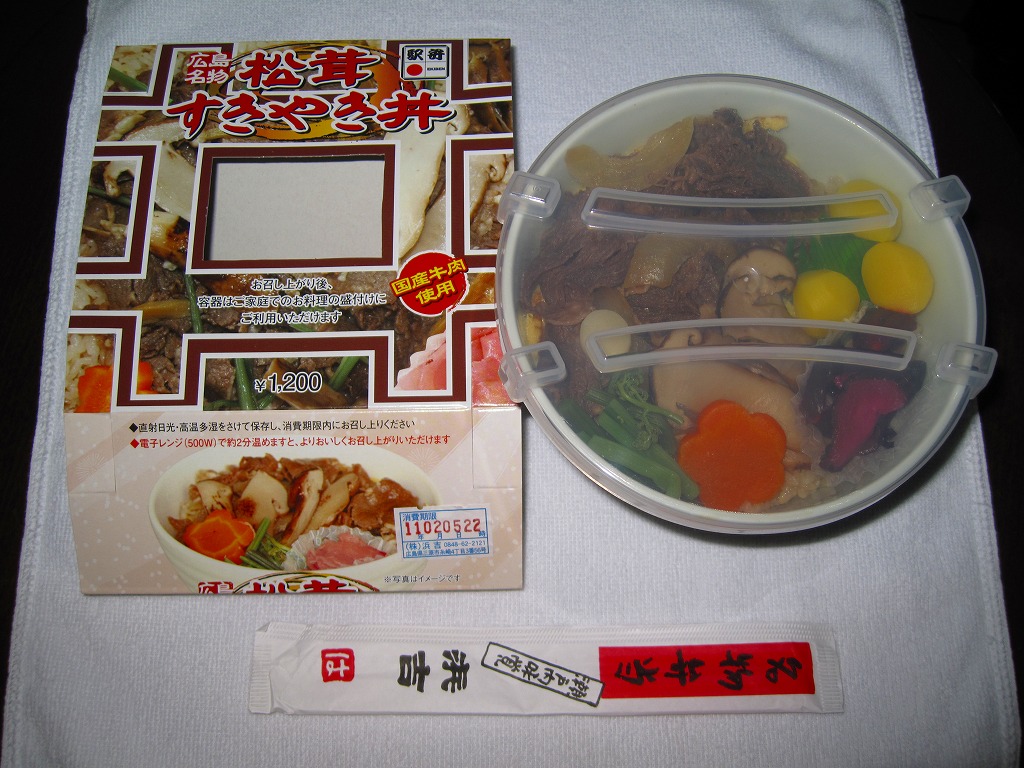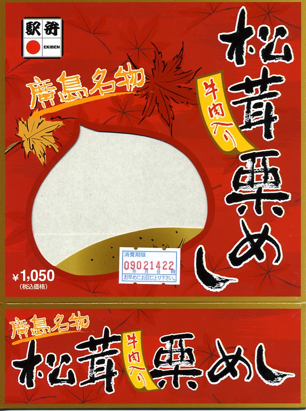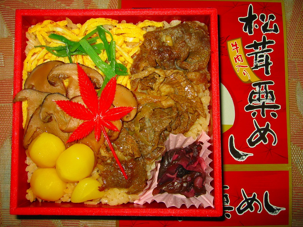 2003(平成15)年に発売か。トレーを接着した容器に透明なふたをかけてフルカラー印刷のボール紙の枠にはめる。中身はそのパッケージの写真そのままに、炊込御飯の上に松茸と牛すき焼き肉に白ねぎや玉ねぎや牛蒡などが載るもので、味も駅弁の名前そのもの。松茸の枚数や厚さもそれほど少なくはない印象で、香りは難しいが食感を感じられるレベルにある。価格は2003年の購入時で1,050円、2014年時点で1,100円、2018年時点で1,150円、2019年時点で1,200円。