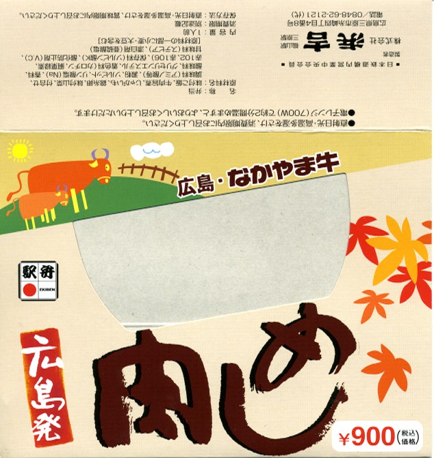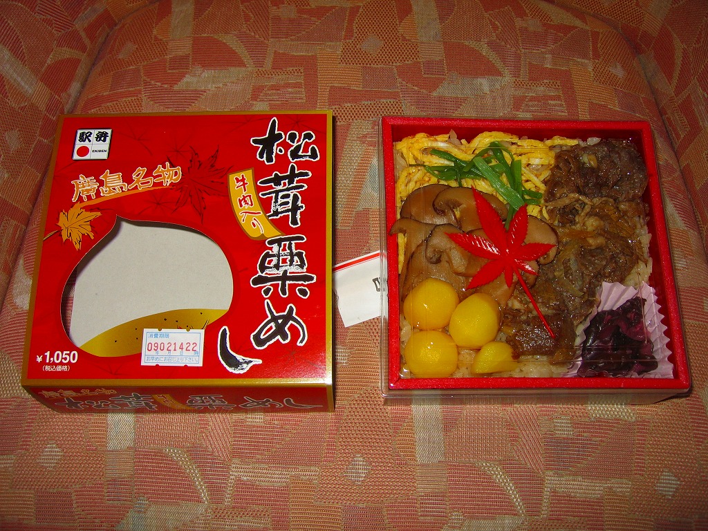 2008(平成20)年の秋までに発売。正方形の赤い容器に透明なふたをして、中身が見える窓開きのボール紙の枠にはめる。中身は名前のとおり、茶飯の上に牛肉と松茸と栗、さらに錦糸卵と柴漬けと模造の紅葉を詰めたもの。分量では「栗入り松茸牛めし」と呼ぶべきかもしれないし、「廣島名物」ではないと思うが、このような内容は広島空港の空弁にもあり、駅弁催事での三原駅弁や福山駅弁としてはおなじみの顔。控えめに濃いけれどはっきりした味付けには安心感がある。2014年頃までの販売か。