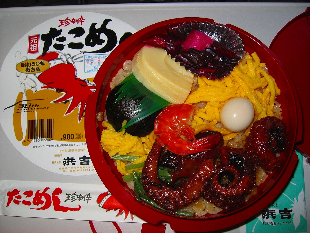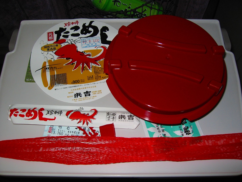 釜型の赤いプラ容器に、デザインが現行と同じ丸い掛紙と割りばしを載せて、ネットに入れる。中身はおなじみの珍辨たこめしで、風味も当然に現在と同じ。当時と異なるのは、三原駅の駅弁販売が改札外コンビニへの陳列に縮小され、主戦場が福山駅に移ったこと。この駅弁も三原駅にはなく、福山駅で買えた。