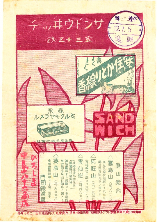 1923(大正12)年7月5日の調製と思われる、昔の広島駅弁の掛紙。所定の広告を掲載し東京で刷り各地で共通して使われた大正時代のもので、絵柄にも広告にも広島がない。とはいえ、この種類の駅弁掛紙でサンドウィッチのものは、あまり見掛けないと思う。