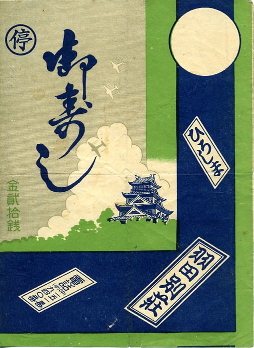1940年代、第二次大戦中のものと思われる、昔の広島駅弁の掛紙。駅名が記載されておらず、駅弁として使われたかどうかは定かでないが、業者名は駅弁屋のもの。広島城と入道雲を背景に戦闘機3機の飛行を描いたものか。インフレ抑制の強攻策として価格を1939年9月18日現在のものに固定するという、同年10月に公布された価格等統制令の適用を示す記号(マル停マーク)が付く。
