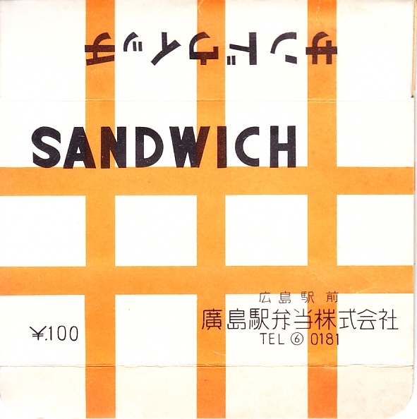 1960年代の調製と思われる、昔の広島駅弁の紙箱。かつて各地の駅弁屋で一般的であり、2000年代までに大船駅と静岡駅くらいでしか見なくなった、箱入りサンドイッチ。