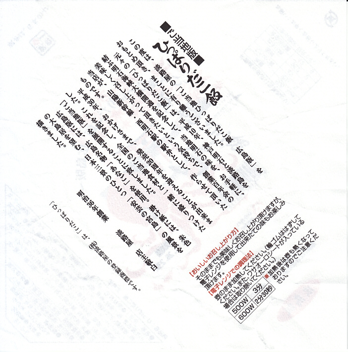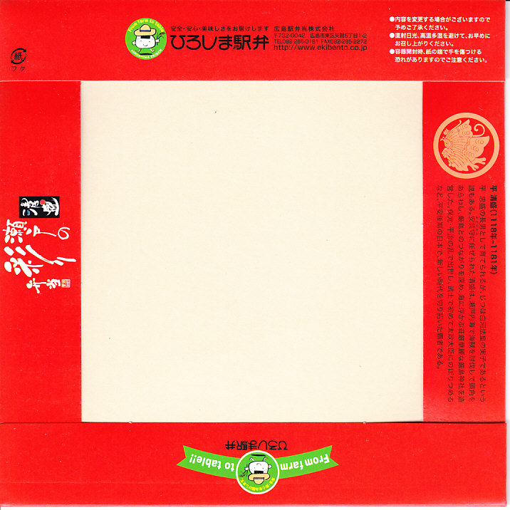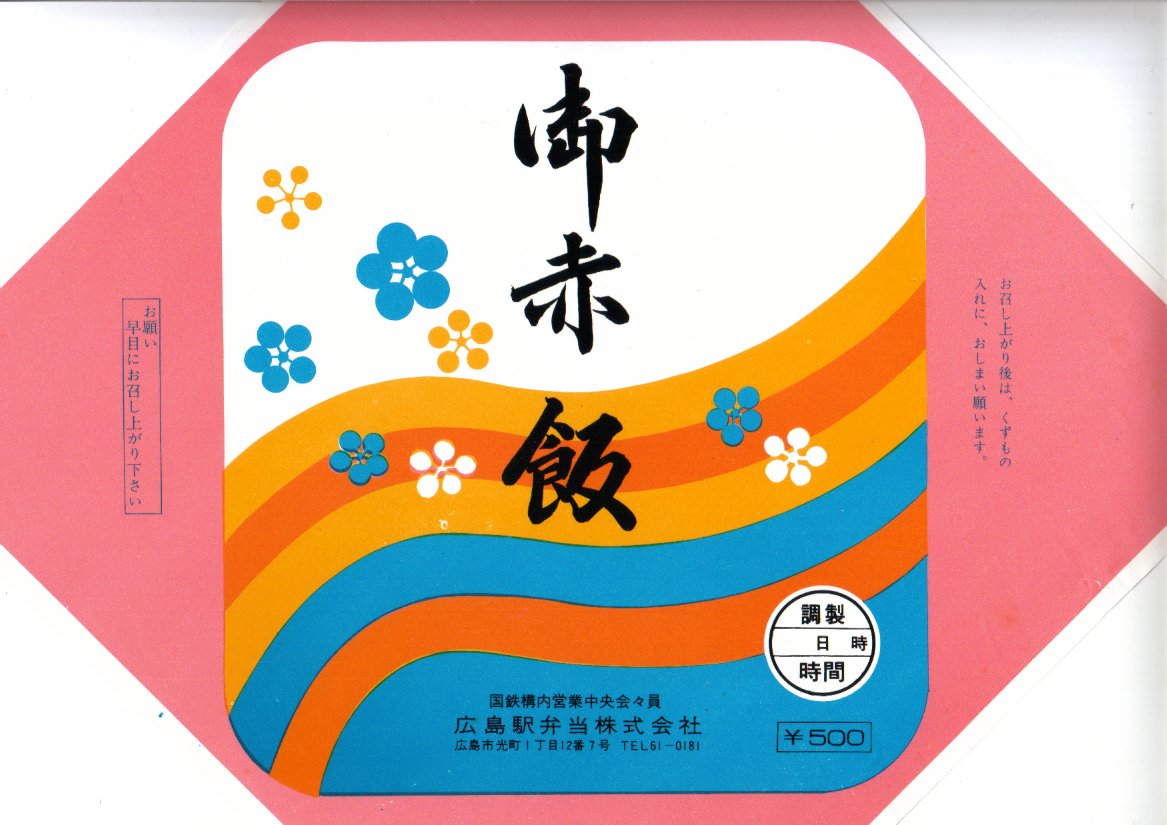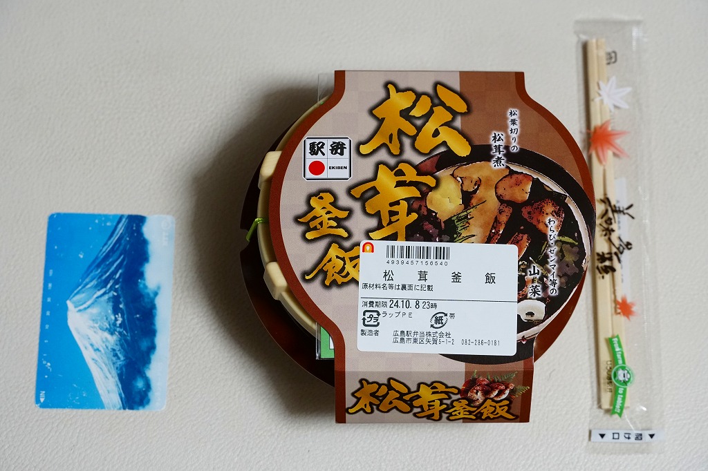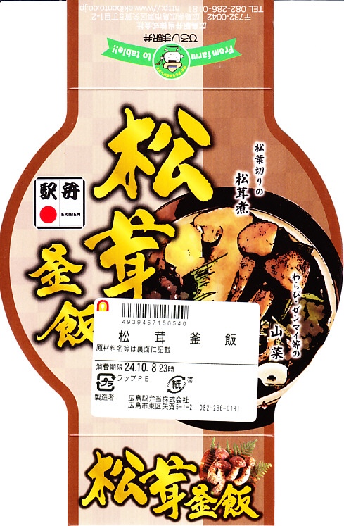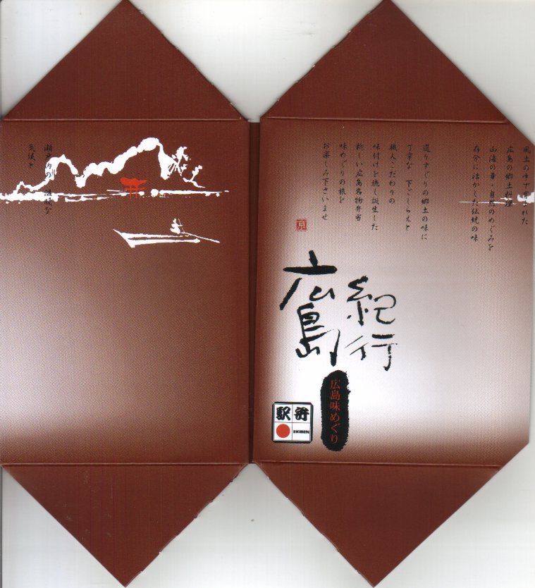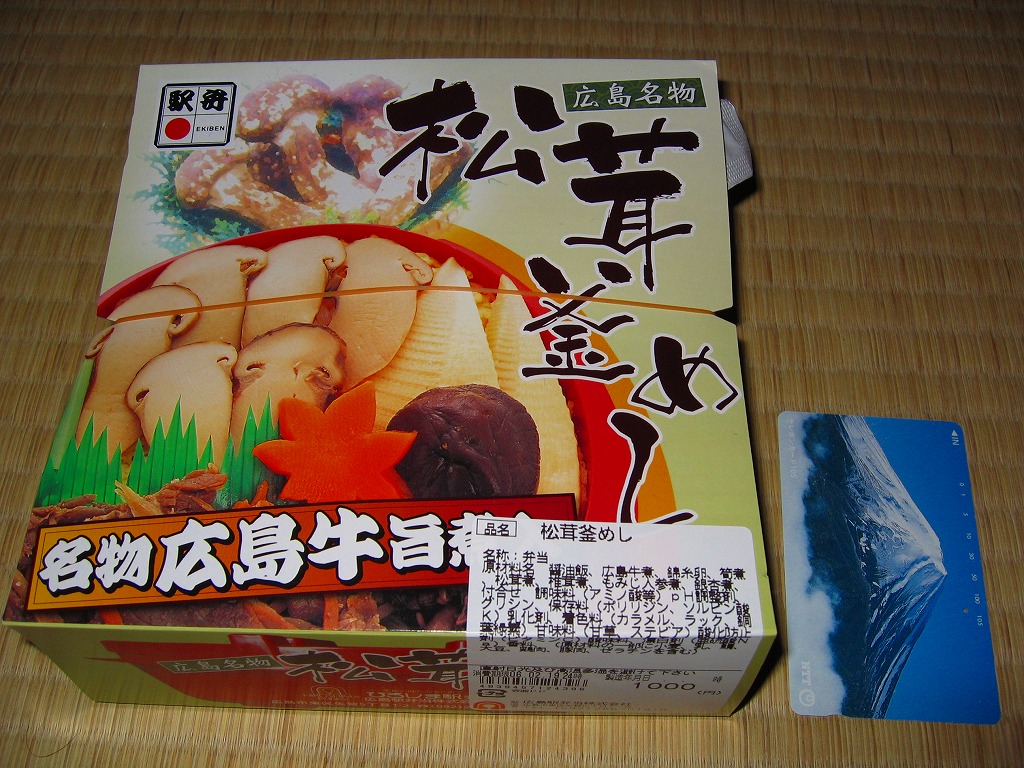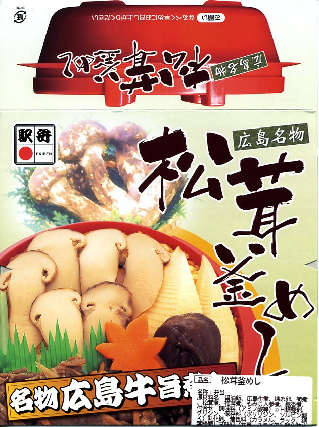 2005(平成17)年の発売か。この形状ははたして釜なのかとも思う、赤く浅いプラ製釜飯容器に割り箸を置いて輪ゴムでしばり、商品名と中身写真を載せた紙枠にはめる。中身は牛肉細切れも載った松茸釜飯。広島名物でもなんでもないと思う、特徴なき釜飯風弁当。現存しない模様。