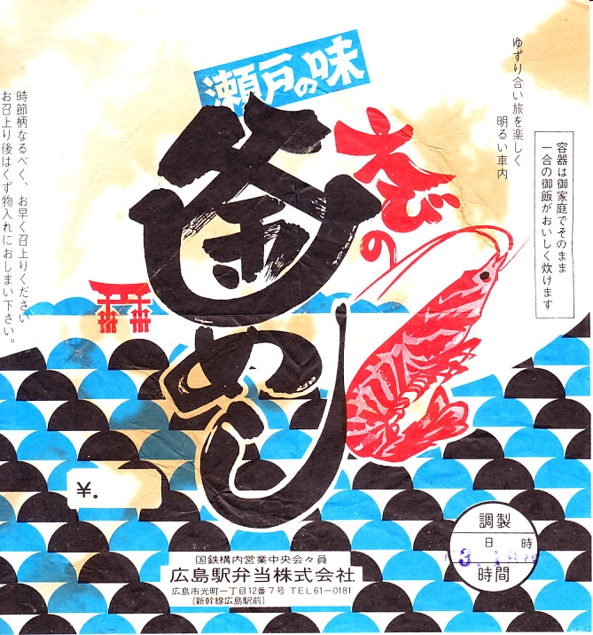 1976(昭和51)年8月3日18時の調製と思われる、昔の広島駅弁の掛紙。その名のとおり、エビを入れた釜飯駅弁だったのだろう。宮島のような風景も描く。