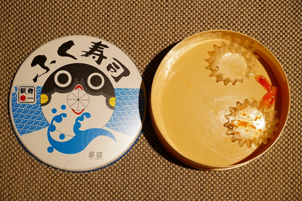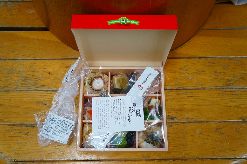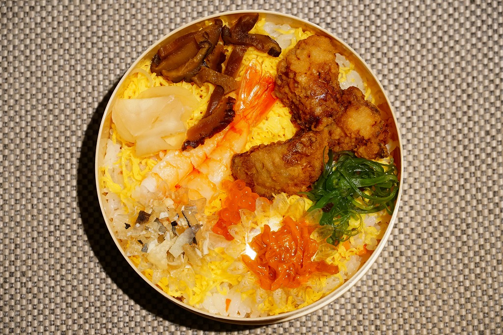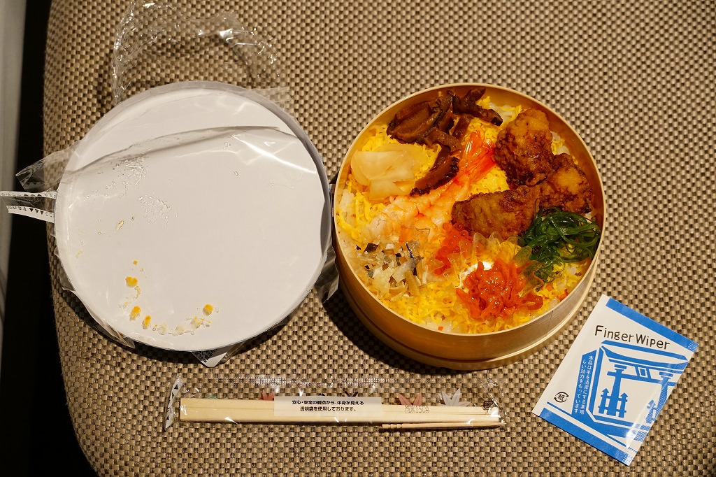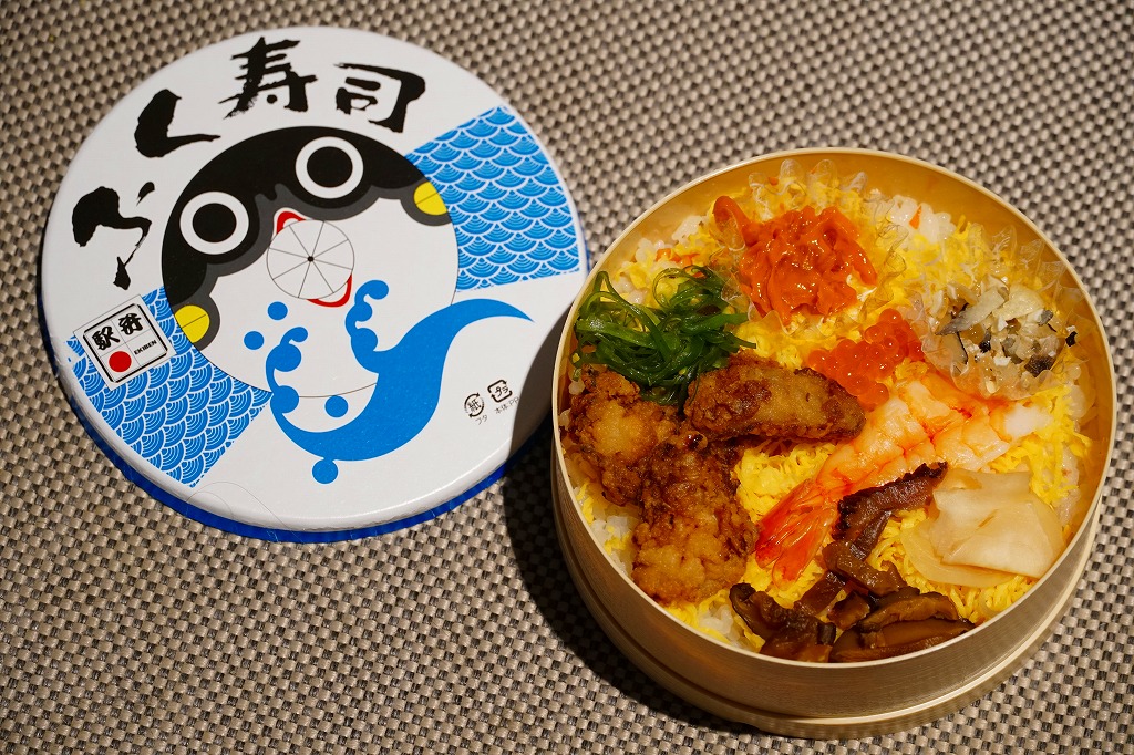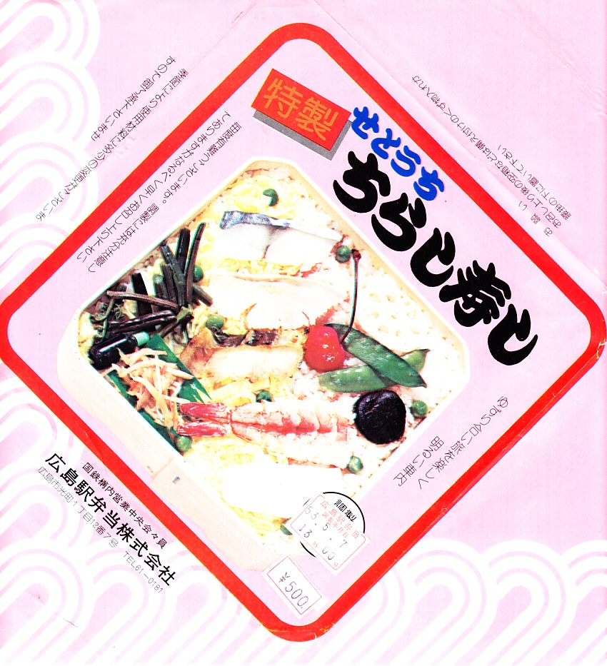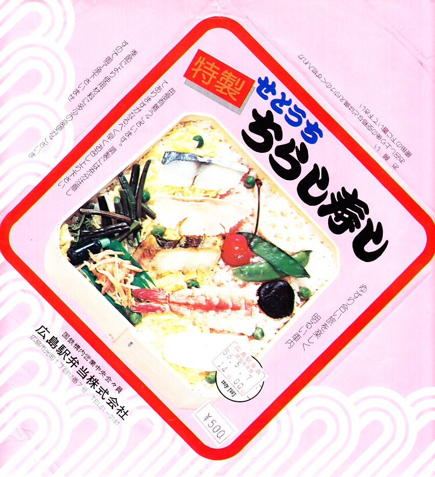 1984(昭和59)年に発売。長方形のボール紙製容器の中に赤いトレーが入る。中身は酢飯に瀬戸内の小魚やえびや山菜がもぐり、上にはエビやイクラや穴子や椎茸などが載るもの。全体の分量もそうだが、特に具の量が少なく、値段を考えてもやや寂しい内容。普通の幕の内弁当か、冬ならば「しゃもじかきめし」を買いたい。