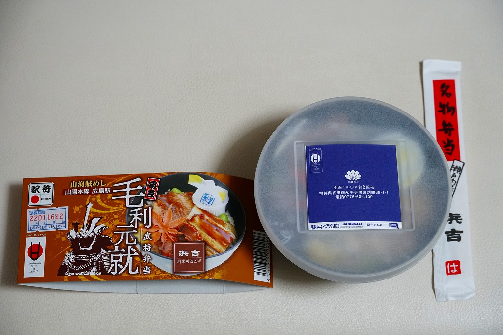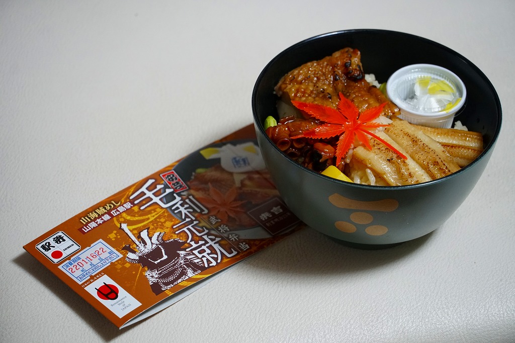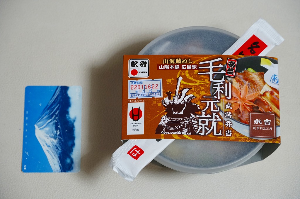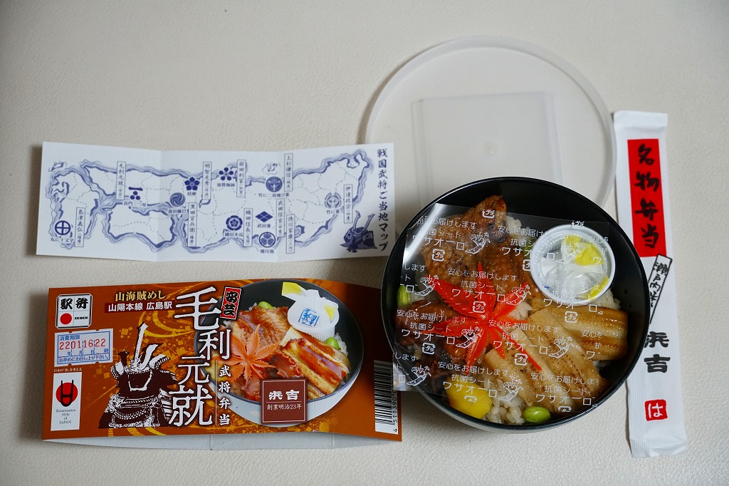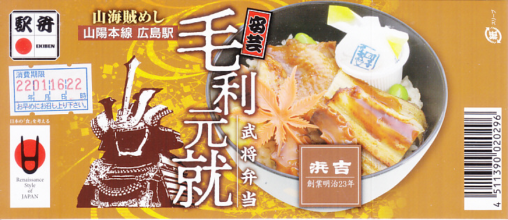 毛利元就(もうりもとなり)は、現在の広島県安芸高田市に生まれた戦国武将。毛利氏の第12代当主として大永3年(1523年)に吉田郡山城を継ぐと、策略に長じ勢力を拡大、半世紀で現在の岡山、広島、島根、山口の各県に相当する6か国を支配する大名となった。1997年のNHK大河ドラマが「毛利元就」で、当時は広島駅で駅弁となった。この駅弁(ではないかもしれないが)の調製元である浜吉は、尾道で創業し、明治時代に駅へ進出して鉄道の機関庫ができた糸崎に転じ、1975年に新幹線の駅ができた三原を拠点とし、2003年に福山駅の駅弁屋の倒産で福山を主戦場とし、既存の駅弁屋が君臨する岡山駅と広島駅にも駅弁を送り込み、徐々に勢力を拡大しつつある。