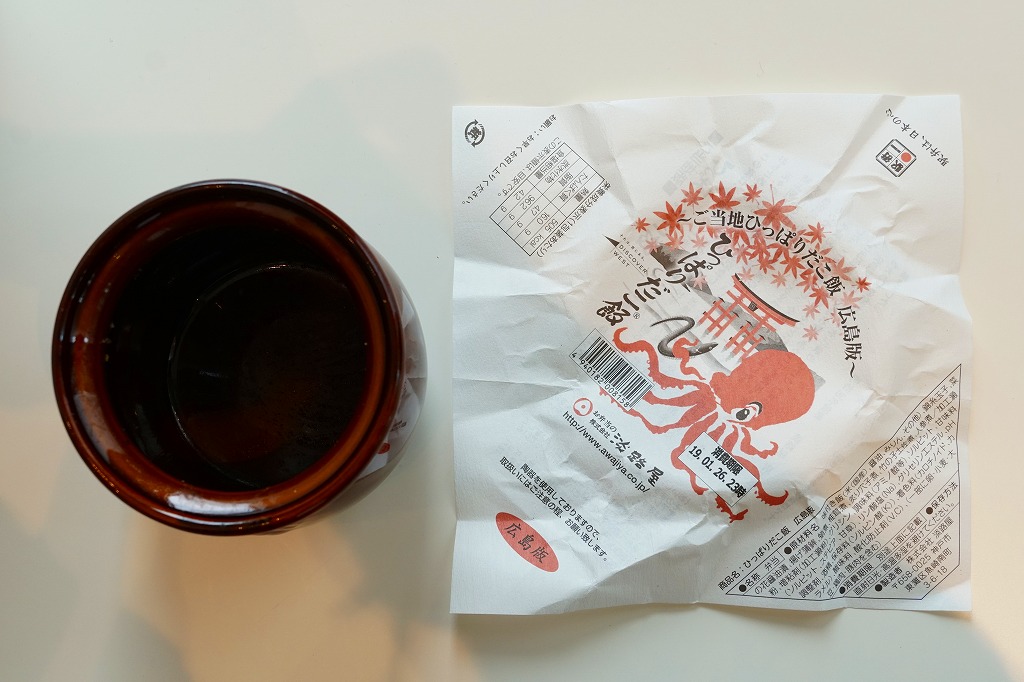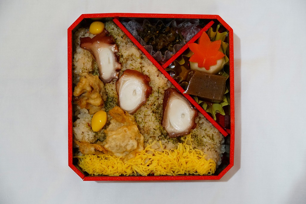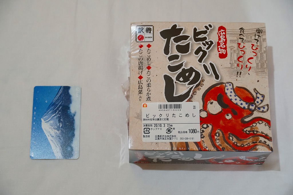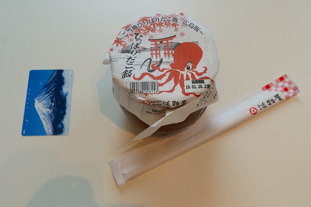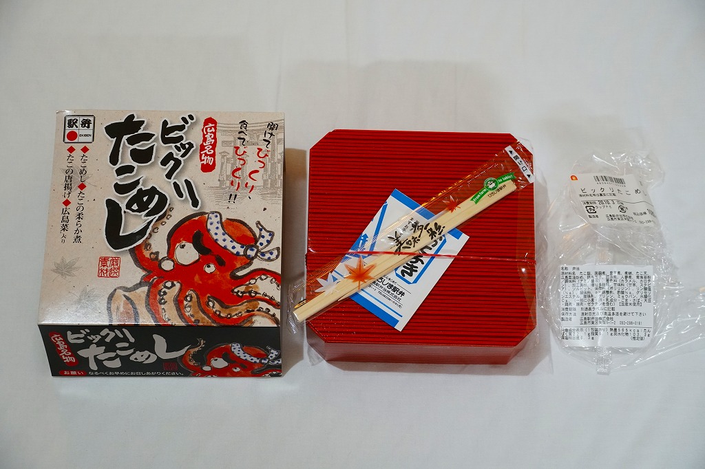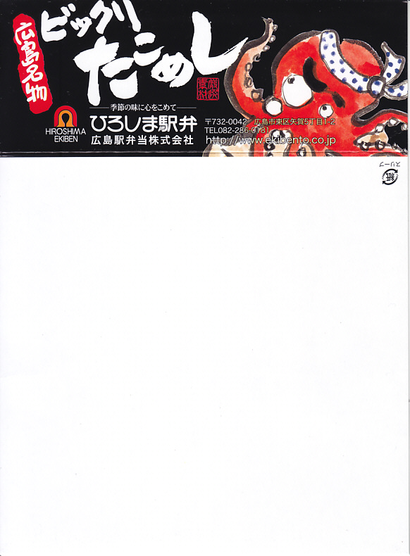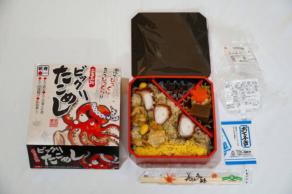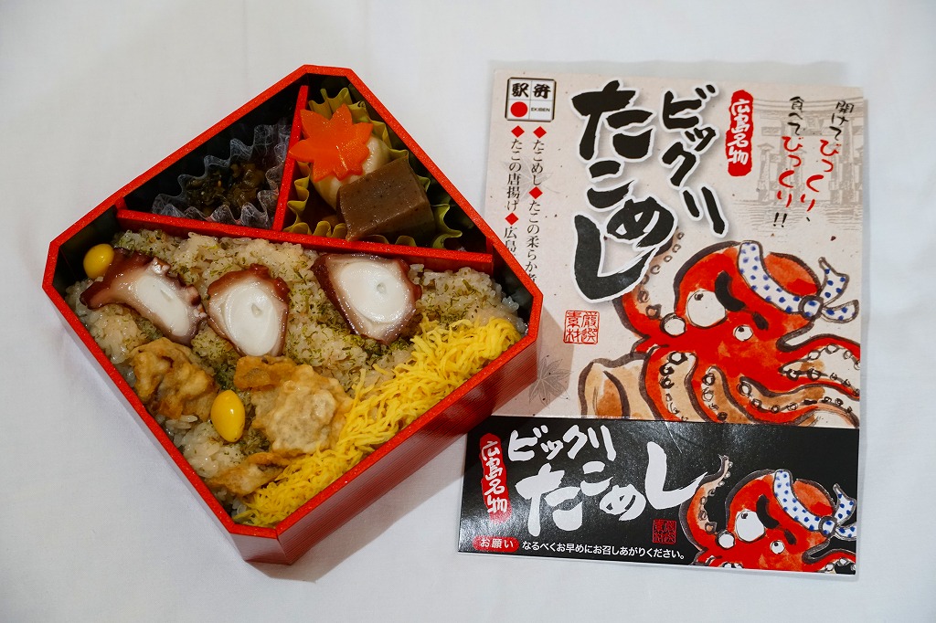 JR時刻表によると2008(平成20)年に1,050円で発売か。正方形の容器にタコ飯を詰め、タコ煮のスライスとタコ天を貼り、錦糸卵とギンナンで彩り、煮物と広島菜油炒めを添える。塩味が濃すぎてビックリするタコ飯だった。駅弁のタコ飯は、駅弁屋の営業エリアでは東隣となる三原駅が元祖となる。価格は2014年4月の消費税率改定で1,080円、2023年時点で1,150円。