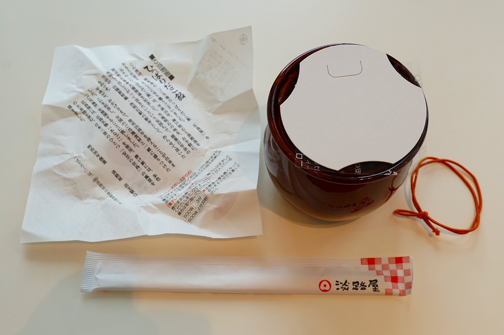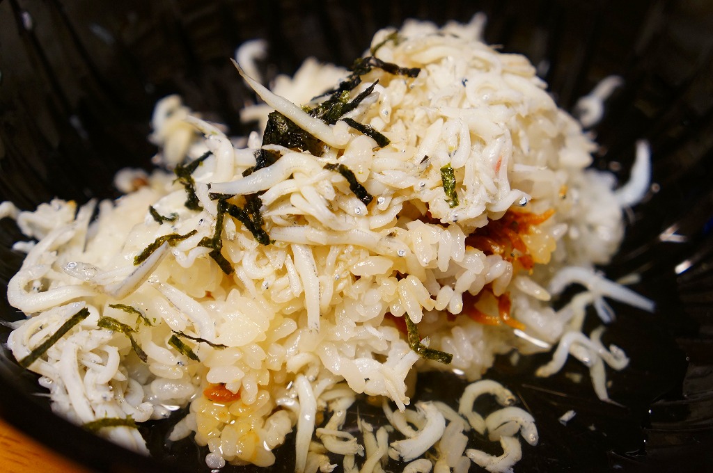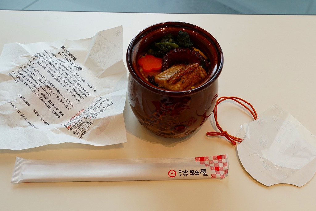 中身もほとんど「しゃもじかきめし」。御飯の部分が共通で、おかずのじゃこが御飯にかかり、こちらはおかずとしてタコ、がんす、大根漬、清盛餅を詰める。この容器を使う「しゃもじかきめし」以外の駅弁の登場は約30年ぶりだろうか。しかしこれとそれを比較すれば、知名度はもちろん味でも中身の充実度でも「しゃもじかきめし」の圧勝だなと感じたし、こちらは催事場でも客が全然付いていなかった。