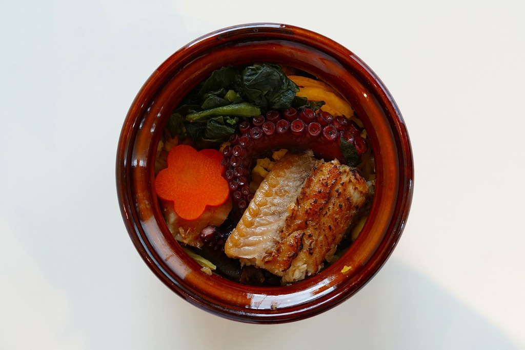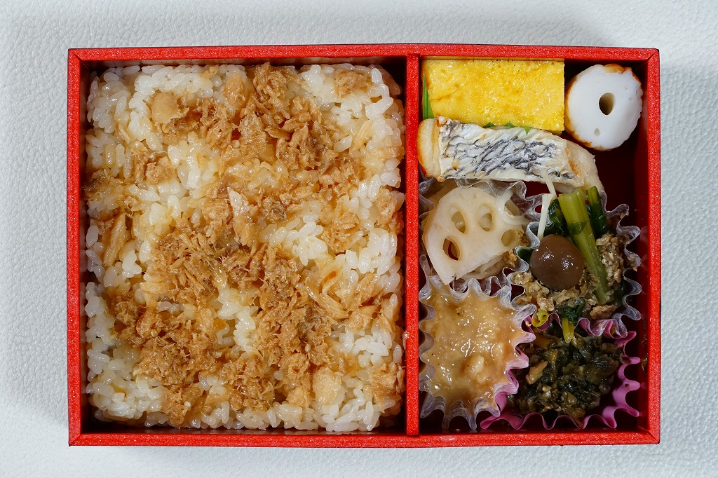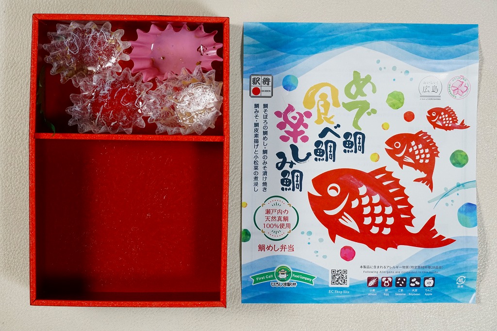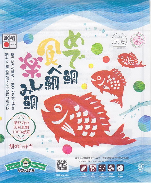 掛紙の表面で鯛や海や商品名をデザインし、裏面でコンセプトや料理人を紹介する。中身は鯛そぼろの鯛めし、鯛のみそ漬け焼き、鯛みそ、鯛皮素揚げと小松菜の煮浸し、玉子焼、ちくわ、酢蓮根とタマネギ酢漬け、広島菜漬ごま油和え。天然真鯛を丸々余すことなく味わっていただけるお弁当といい、淡い味の飯や魚と、味付けしっかりの副菜で、上品に思えるタイづくし。
