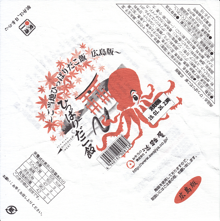 2018(平成30)年9月6日に広島駅で発売。兵庫県の西明石駅弁「ひっぱりだこ飯」の発売20周年を記念した企画の第2弾として、この駅弁の広島版を制作したそうな。見た目や内容や風味は、西明石駅弁とほとんど同じ。広島版ということで、掛紙に厳島神社の大鳥居を描き、中身に炙り穴子煮を加えた。2022年で終売か。
