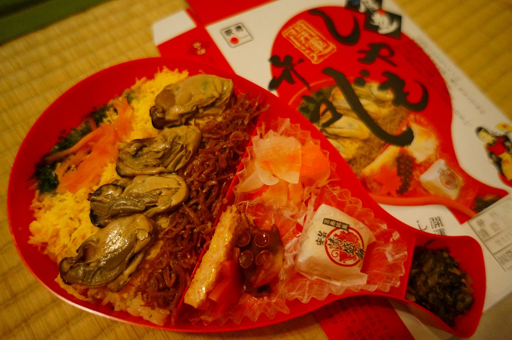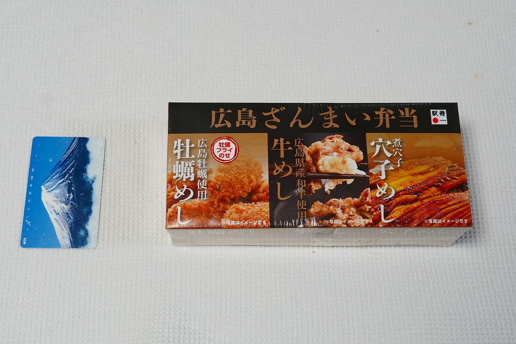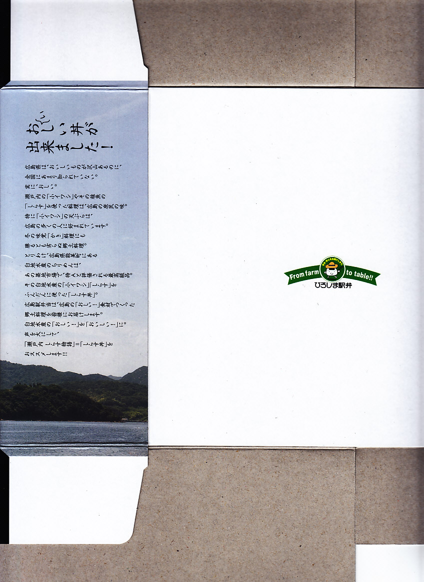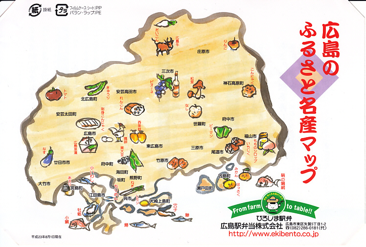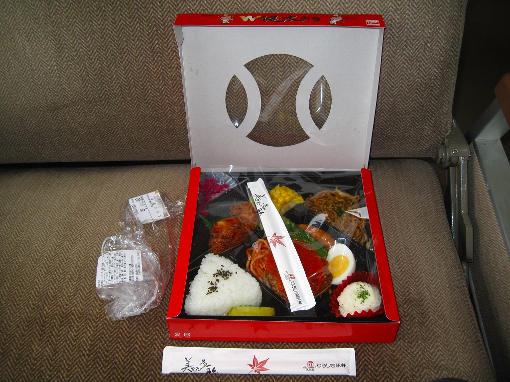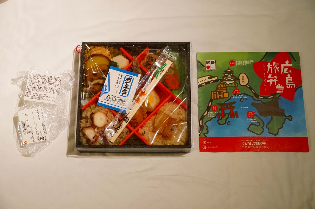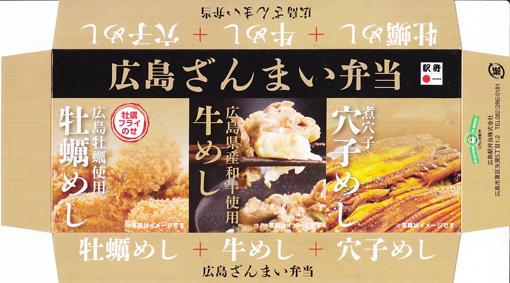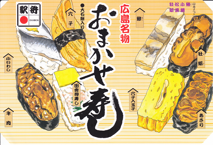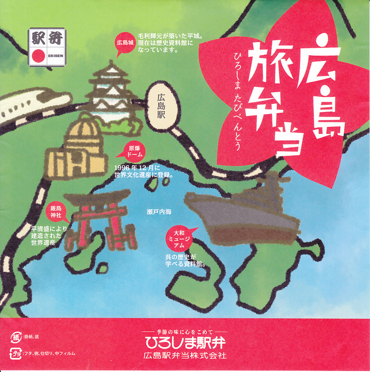 2015(平成27)年8月までに発売。小さな掛紙には広島が誇る観光名所「広島城」「原爆ドーム」「大和ミュージアム」「厳島神社」の地図が、簡単な絵柄で描かれる。中身はタコ飯、穴子飯、牛肉煮、煮物、揚げ玉子やカキフライなどの5区画。広島の食をなんとなく反映しているように見える、幕の内弁当でないけれどそんな用途に向いた駅弁。2020年の春頃までに終売か。