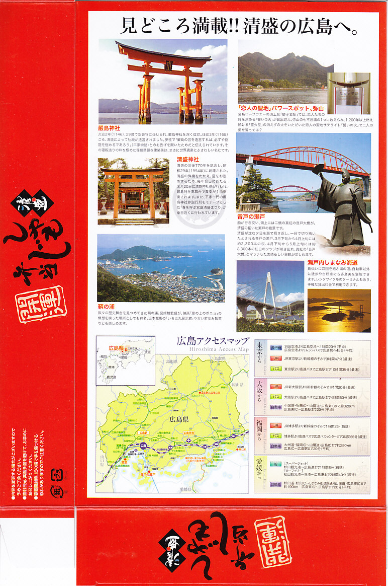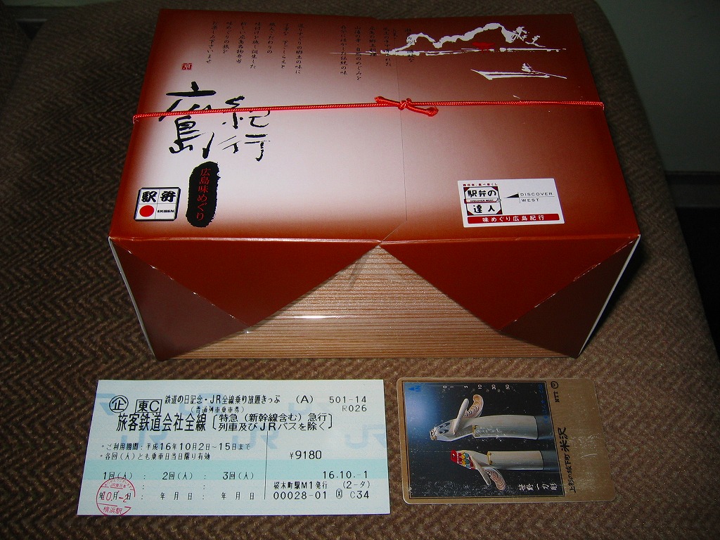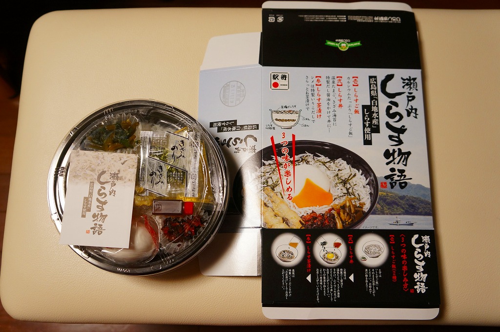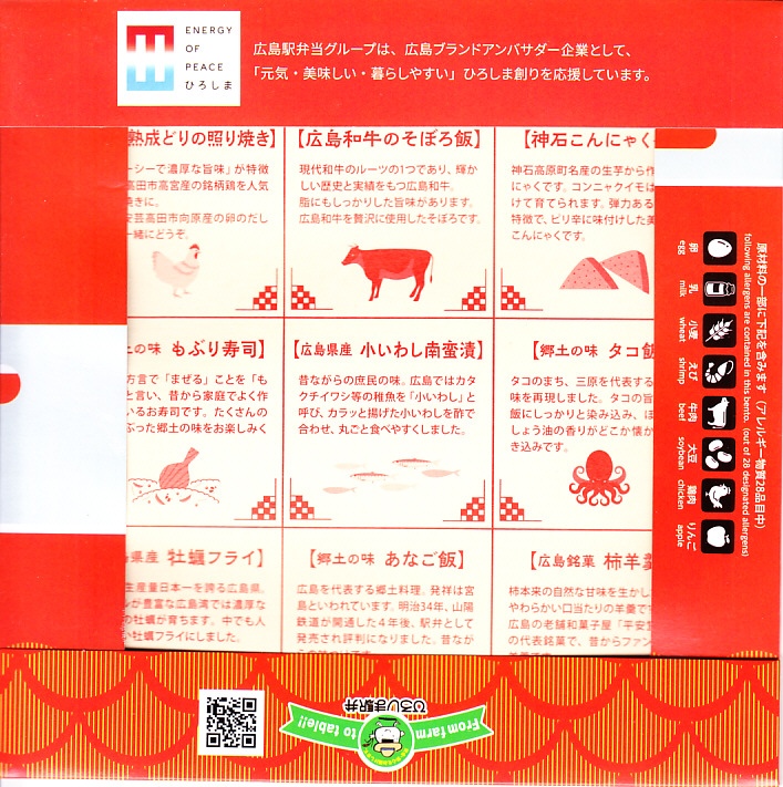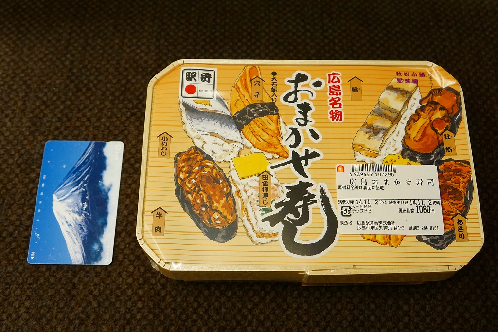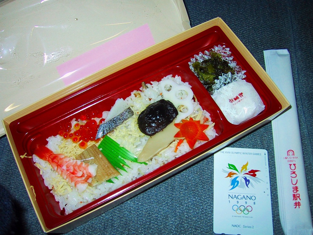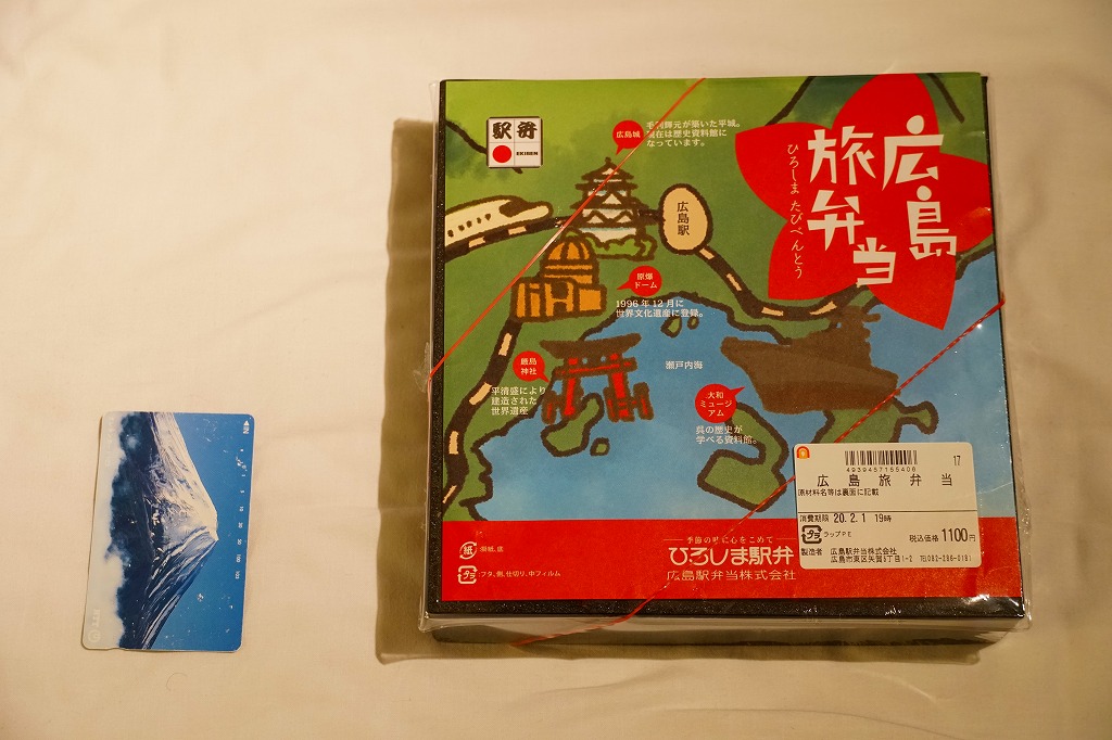 2015(平成27)年8月までに発売。小さな掛紙には広島が誇る観光名所「広島城」「原爆ドーム」「大和ミュージアム」「厳島神社」の地図が、簡単な絵柄で描かれる。中身はタコ飯、穴子飯、牛肉煮、煮物、揚げ玉子やカキフライなどの5区画。広島の食をなんとなく反映しているように見える、幕の内弁当でないけれどそんな用途に向いた駅弁。2020年の春頃までに終売か。