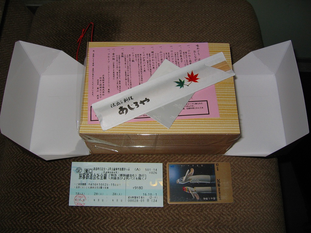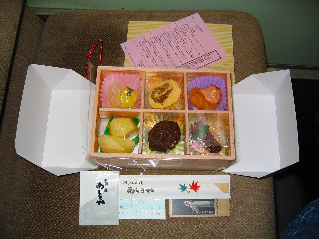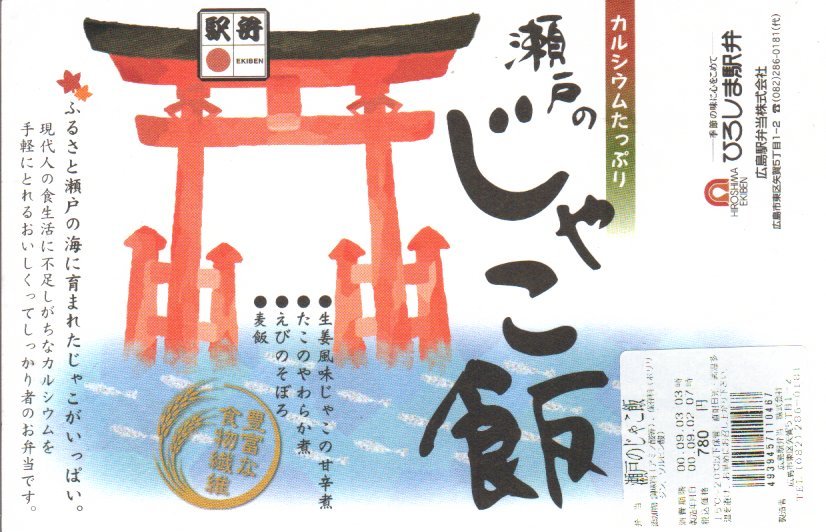 個々の食材の個性とサイズが大きく、風味も雰囲気も良い駅弁。しかし箸袋に「仕出し料理 あじろや」と脱駅弁のブランド名を掲げていたり、普段の広島駅での弁当販売状況を見ると、この調製元は駅弁への関心が薄いのではないかと思われてならない。現在は売られていない模様。