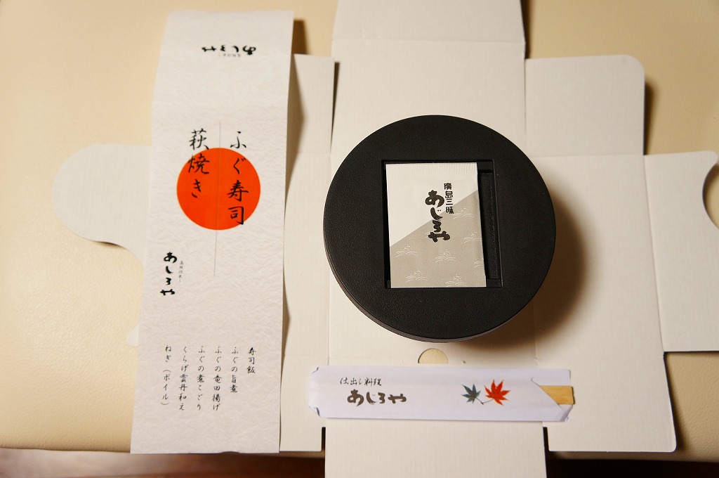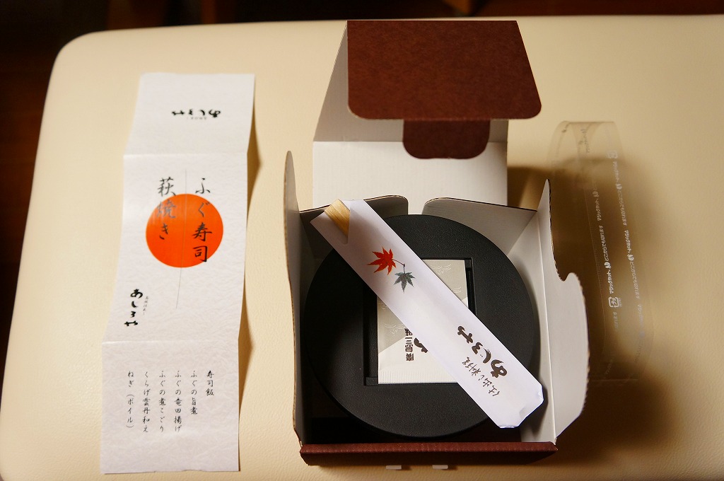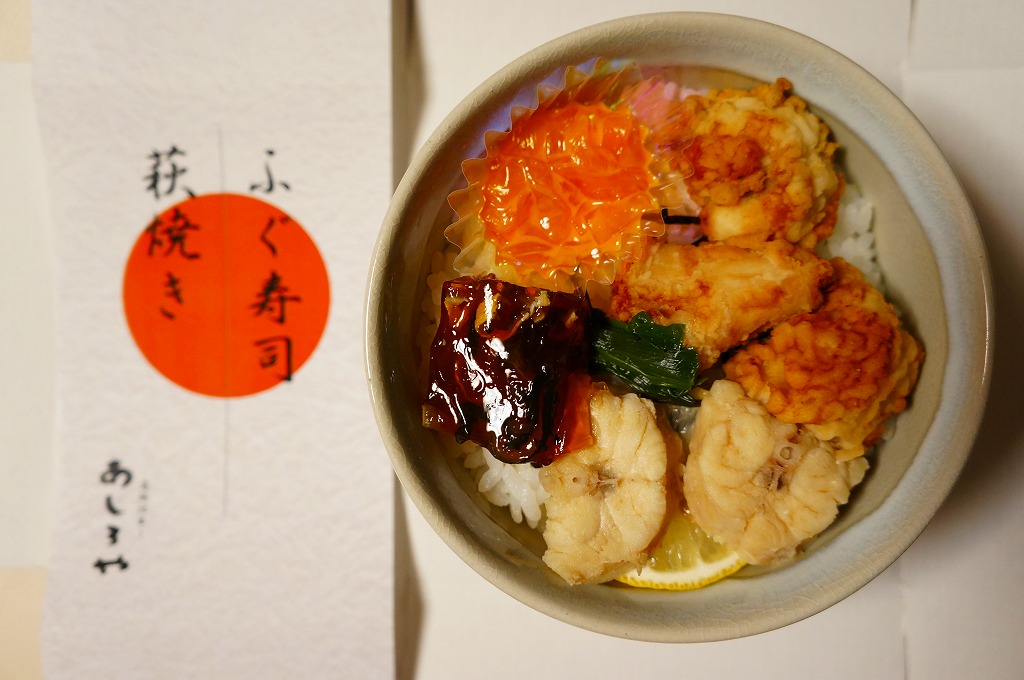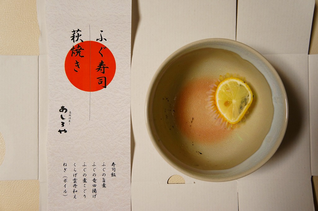 中身は酢飯の上にフグの旨煮を2個と竜田揚を3個置き、フグの煮こごり、クラゲの雲丹和え、レモンなどを添えるもの。メインのフグは、小骨や大骨に難儀するものの、ふんわり香り、味に文句はない。でも、駅弁を名乗らないで欲しいと願う。商品そのものでは駅弁屋を名乗らず、調製元の駅売店や仕出しでのブランド「あじろや」としてはいる。
