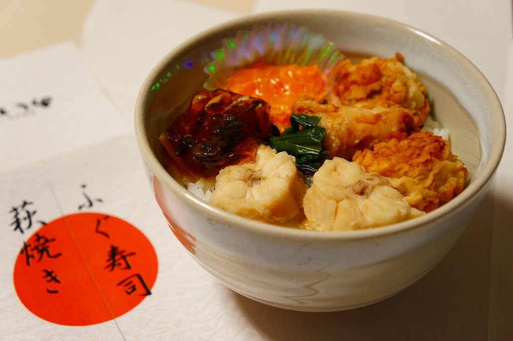 強度のある丸いプラ容器に、形もフグのイラストも真ん丸のふたをする体裁は、下関駅弁の時代から変わらない。この容器に酢飯を詰めて、錦糸卵で覆い、フグの唐揚げ、フグ皮のポン酢しょうゆ漬け、えび、茎わかめ、くらげウニ和え、いくら、でんぶ、ガリを散らす中身は、調製元の変更とともに変遷した。