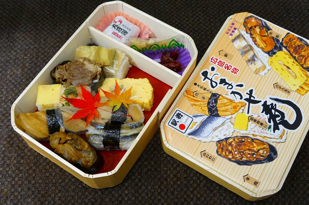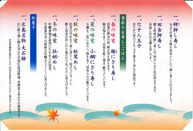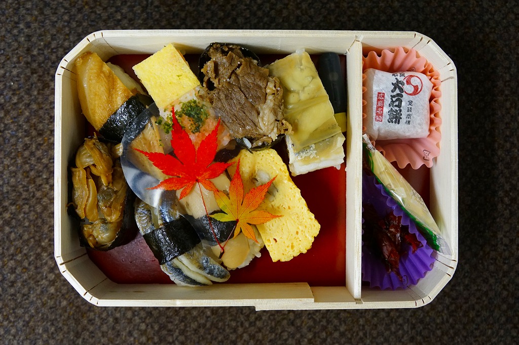 小柄のわりには深めな折箱に、8種8個の寿司等と、大石餅、ガリ、柴漬けを収める。広島の八珍を詰めたとも、寿司屋に「おまかせ」を注文すると出てくるものをイメージしたともされる中身は、穴子にぎり寿し、小いわしにぎり寿し、あさり軍艦巻寿し、牛肉軍艦巻寿し、鯵押し寿し、田舎押寿し、穴子入玉子の7個と、サワラ、小鯛、松茸、牡蛎で回す季節のひとつ。見た目は普通で、構成は普通でなく、しかし無難においしい、創作にぎり寿司。2018年頃までの販売か。