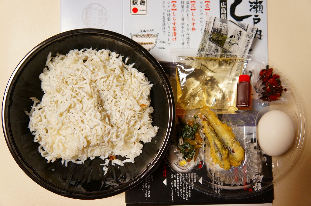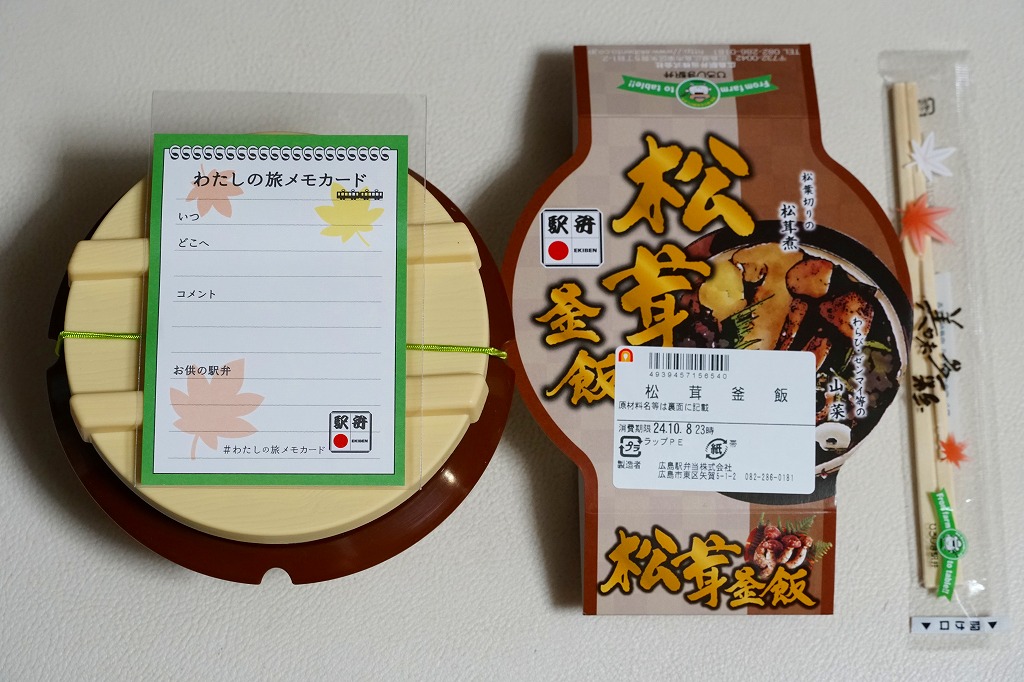 群馬県の横川(よこかわ)駅弁のおかげで、釜飯には駅弁のイメージがあるので、新幹線拠点駅に釜飯駅弁があるのは良いと思う。ただ、現地での販売は確認できていない。なお、東隣の駅弁屋である三原駅には同じ名前で定番の駅弁があるほか、JR広島駅の西隣には、群馬県の駅と同じ表記の横川(よこがわ)駅がある。