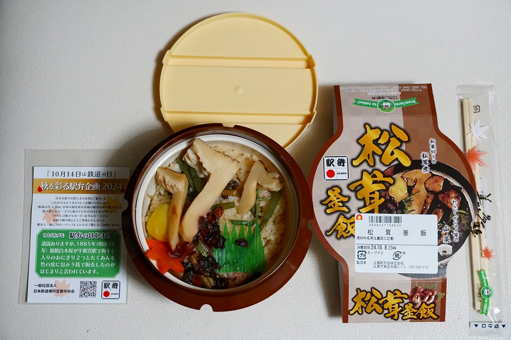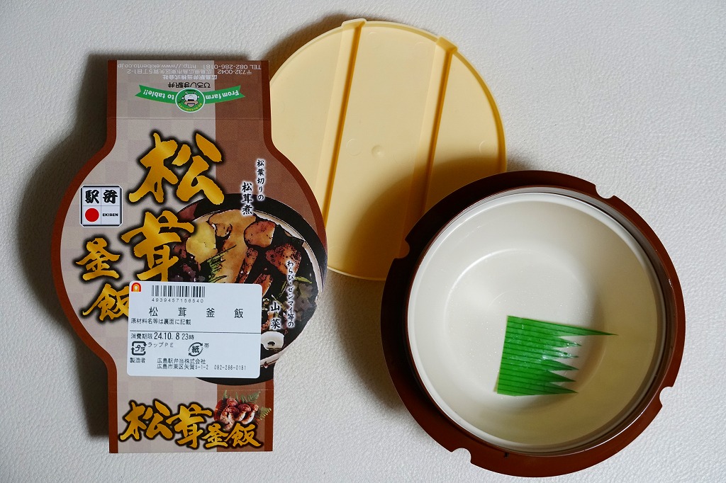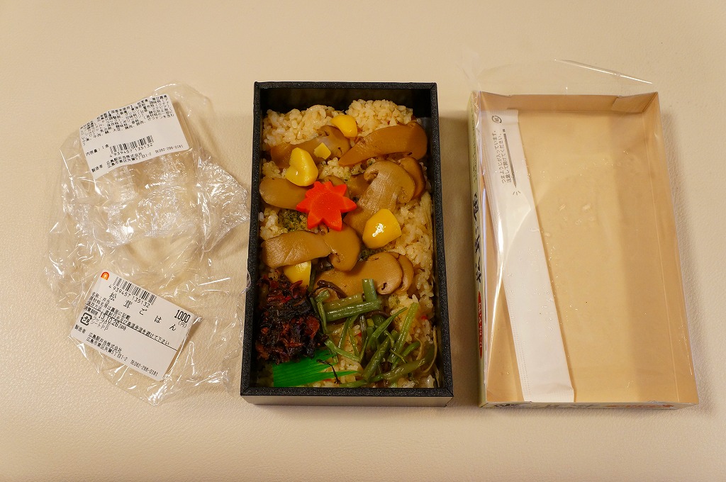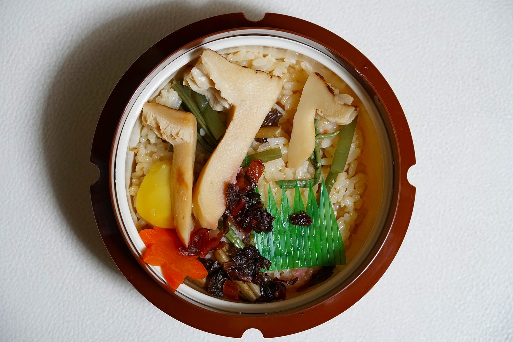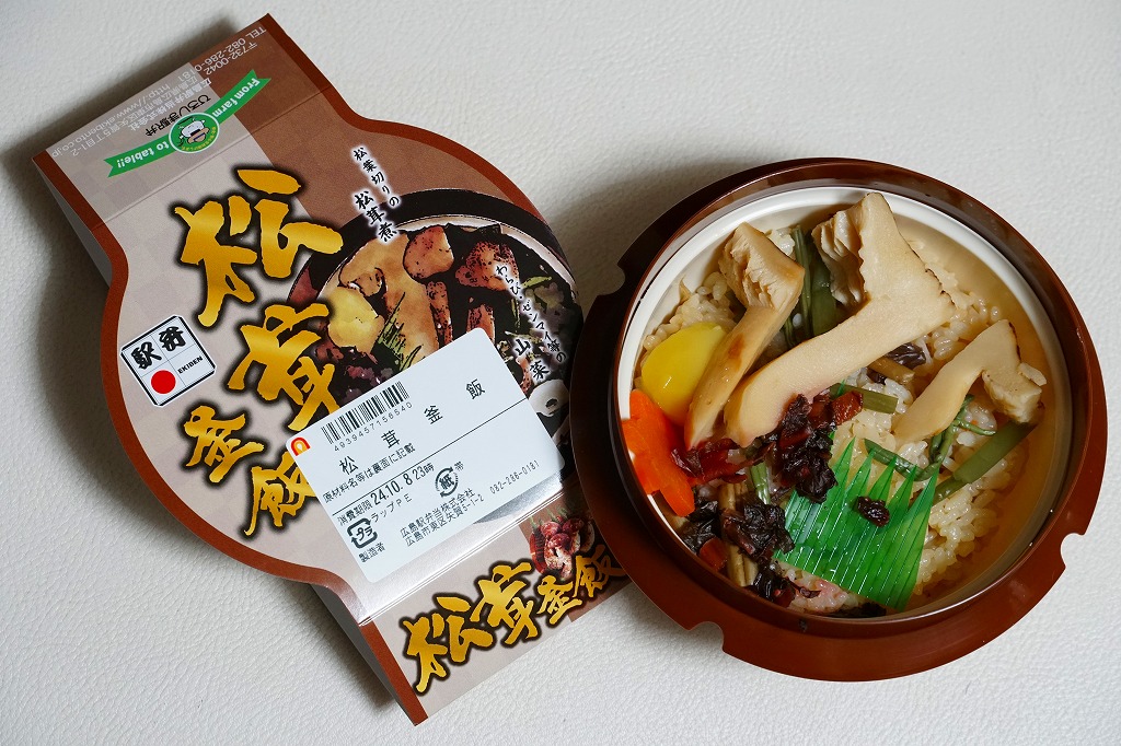 釜飯駅弁向けのプラ容器に炊込飯を詰め、松茸の松葉切りを3本載せて、山菜、くり、にんじん、広島菜漬も載せる。2010年代には少なくなったと思うが、秋冬のスーパーの駅弁大会でよく見るタイプのマツタケ駅弁にみえる。それらがマツタケを手指の大きさのスライスで数切れ入れるくらいであるのに対し、こちらは傘の形が分かるカットでたっぷり。商品名やイメージイラストだけでなく視覚で、マツタケがちゃんと感じられた。煮汁をたっぷり吸っていて、香りを感じるほどではない。あと10年も経てば香る松茸駅弁になるかどうか。