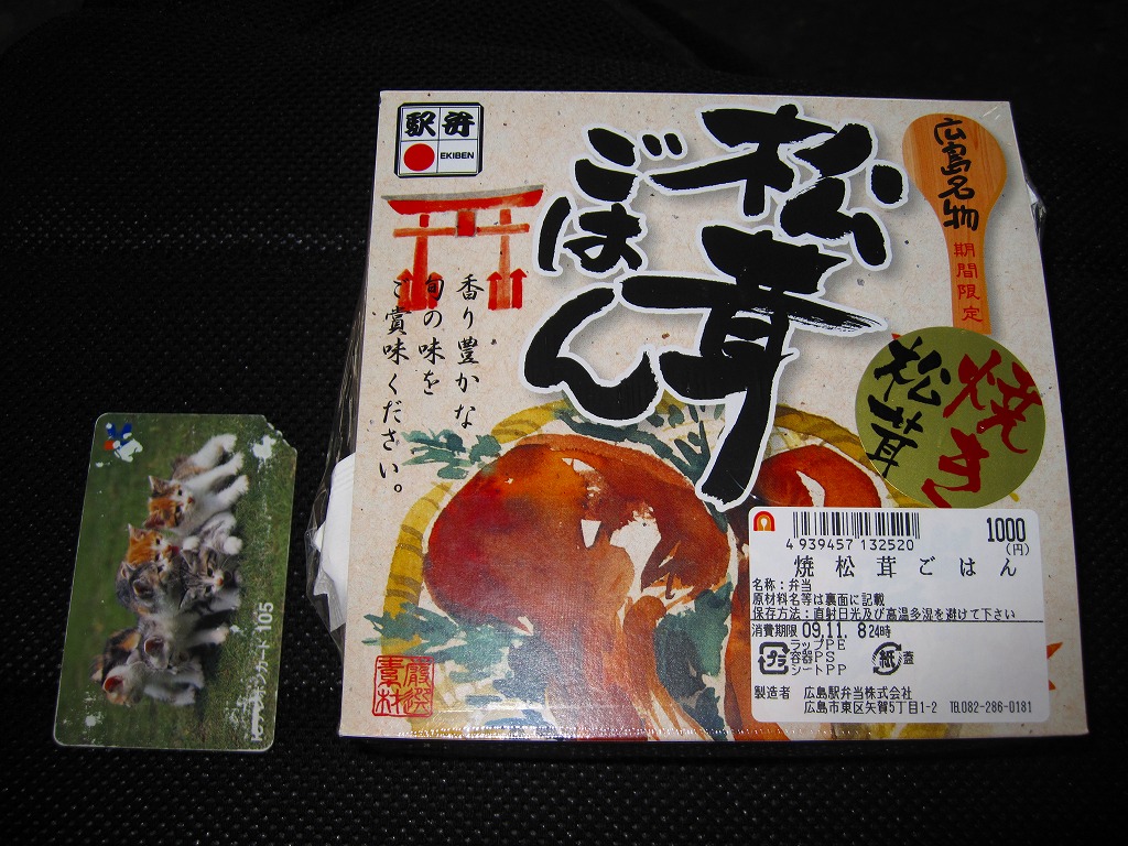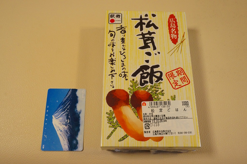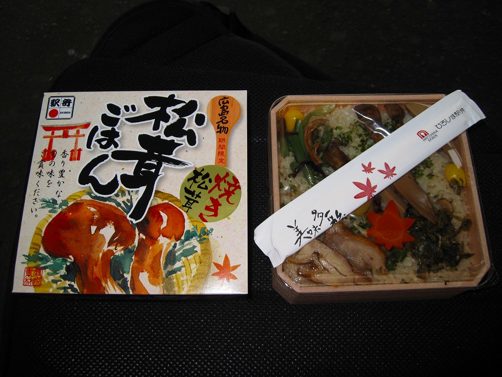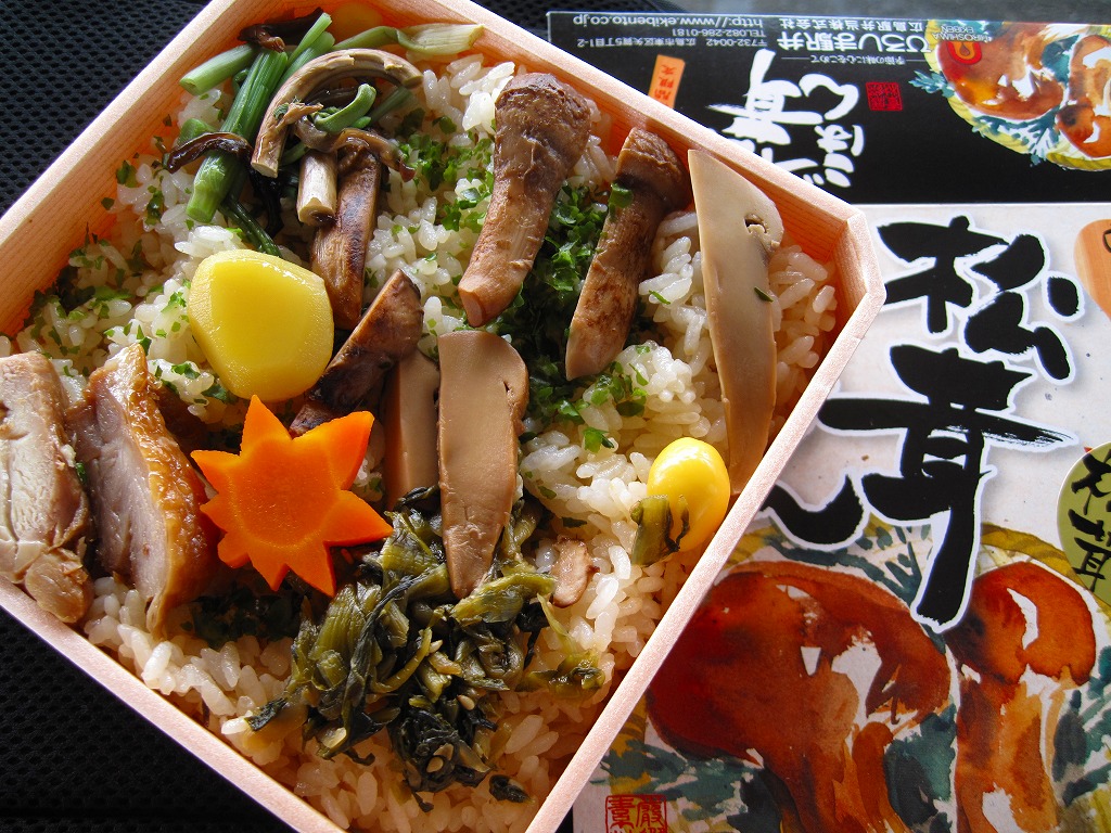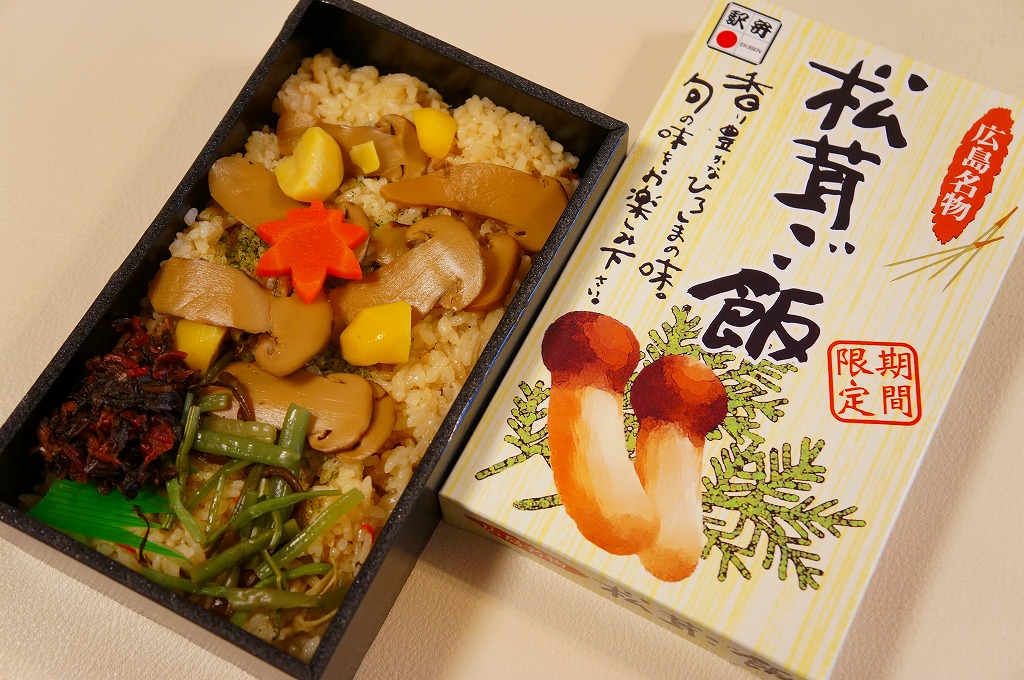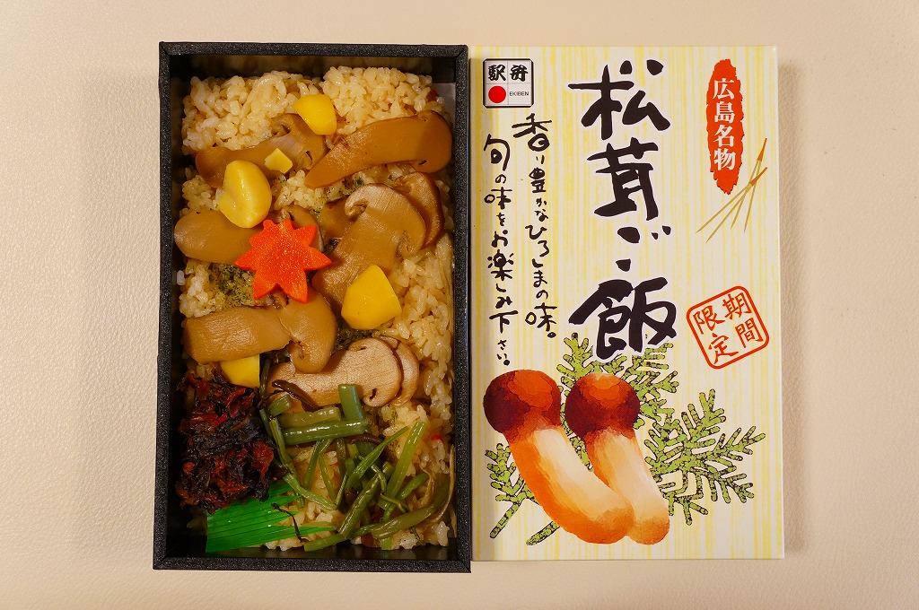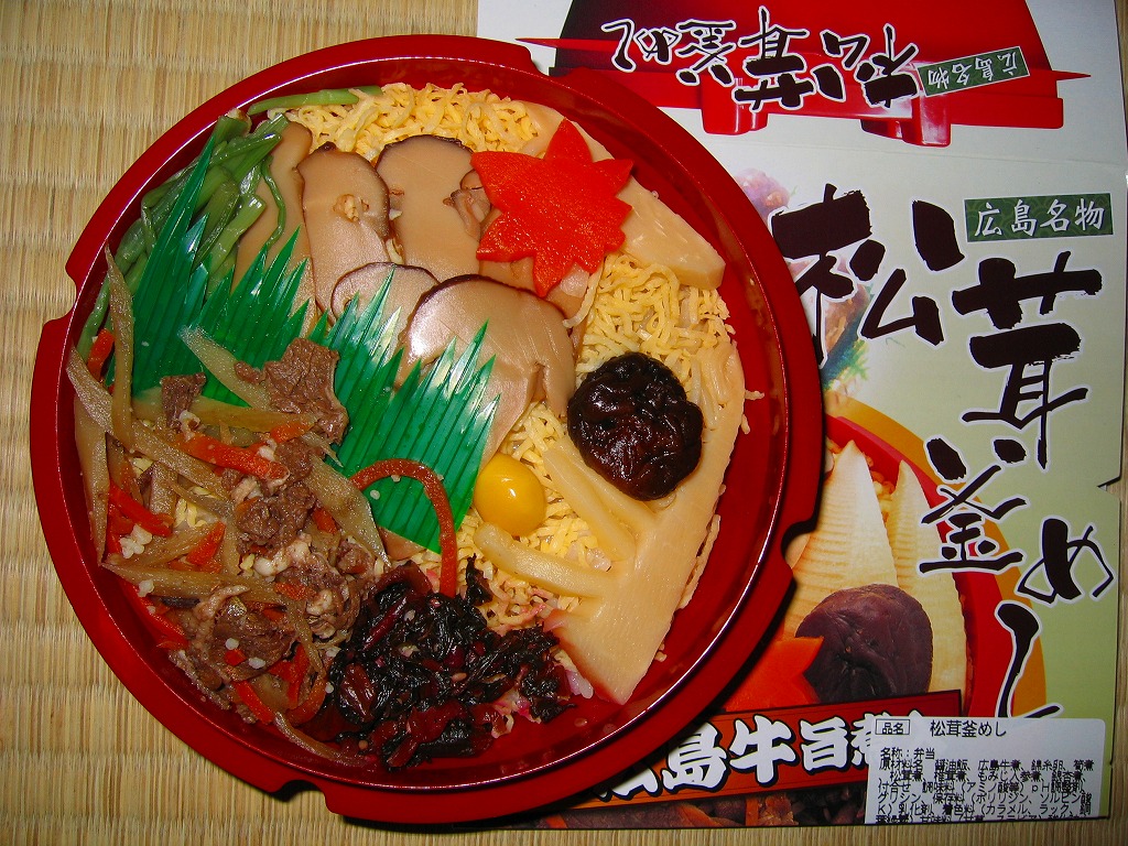 上記の駅弁「広島名物松茸ご飯」のリニューアル品か。正方形の容器に透明なふたをして、松茸と駅弁の名前と大鳥居をしゃもじを描いたボール紙のパッケージにはめる。中身はマツタケの混ぜ御飯の上にマツタケ、クリ、ニンジン、鶏照焼、山菜、広島菜漬を載せるもの。マツタケは頭から4分割して6切れ、つまり1本半も入る豪華版。パッケージのシール「焼き松茸」ではなく食品表示ラベル「松茸煮」は、香りや食感こそスライスのものと変わらない程度だが、その代わりに上げ底の松茸御飯が良い香りを出していた。