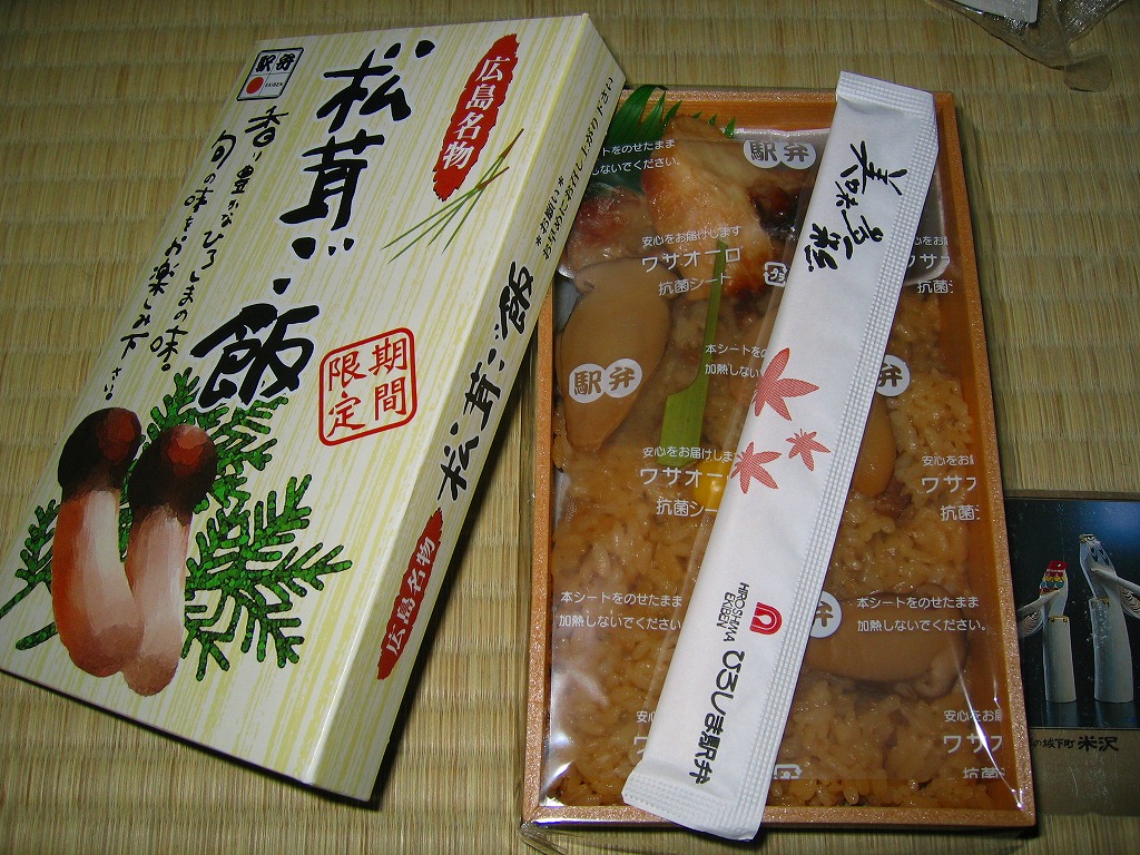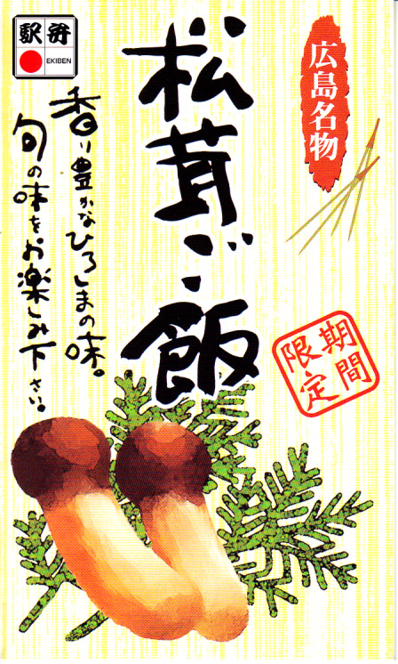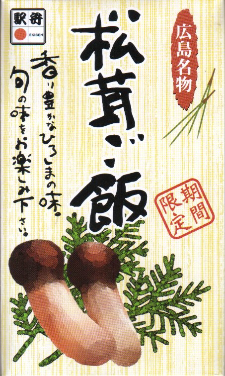 広島駅の秋季限定の駅弁。2004年の購入当時、ネット上の「駅弁図鑑西日本版」では「時価」と恐ろしい表現になっていたが、同じく昔の資料で時価とされた有名駅弁「しゃもじかきめし」と同じく、1,050円に収まるのだと思う。薄く小さい長方形の容器にボール紙でふたをして、広島駅弁らしくラップで密封する。中身はそのまんま、鶏照焼を添えた松茸御飯。1ミリ厚5切れの松茸で香りと食感をギリギリ確保していた。価格は2004年の購入時で1,050円、2012年時点で1,000円、2015年時点で1,080円。2010年代は催事専用で売られた模様。2018年頃に終売か。