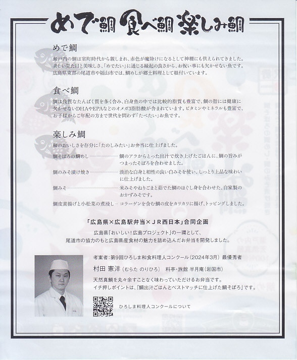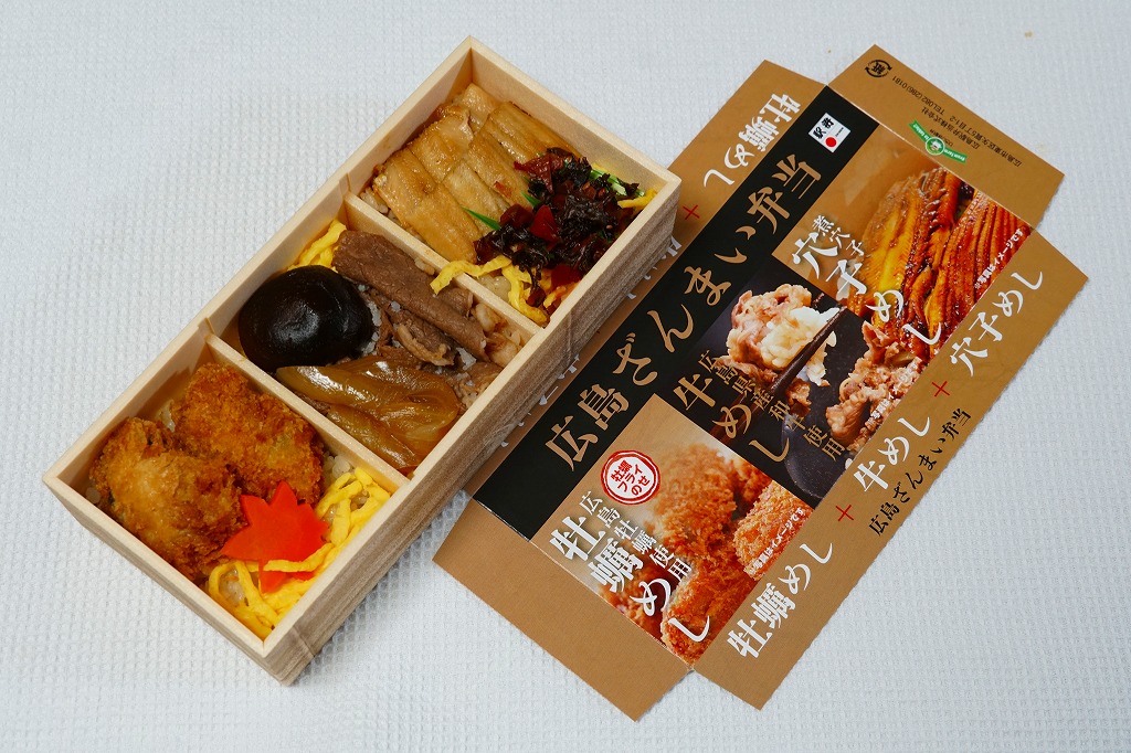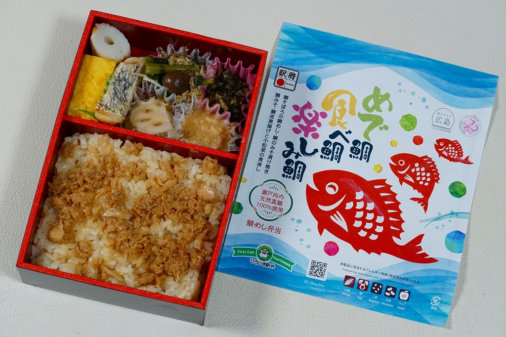 2025(令和7)年3月17日に広島駅などで発売。広島県農林水産局販売・連携推進課が実施する食文化ブランドイメージ向上企画「おいしい!広島プロジェクト」の一環として、広島県商工労働局観光課と料理人コンクール実行委員会が実施する応募企画「ひろしま料理人コンクール」の、2023年度の第9回ひろしま和食料理人コンクールの最優秀者が考案した瀬戸内の天然真鯛の弁当を「めで鯛たべ鯛楽しみ鯛」(1,380円)として、2024年度の第10回ひろしまシェフ・コンクールの最優秀者が考案した比婆牛の弁当を「比婆牛のローストビーフ弁当」(2,800円)として、広島県とJR西日本広島支社と調製元の合同企画で広島駅の駅弁とした。
