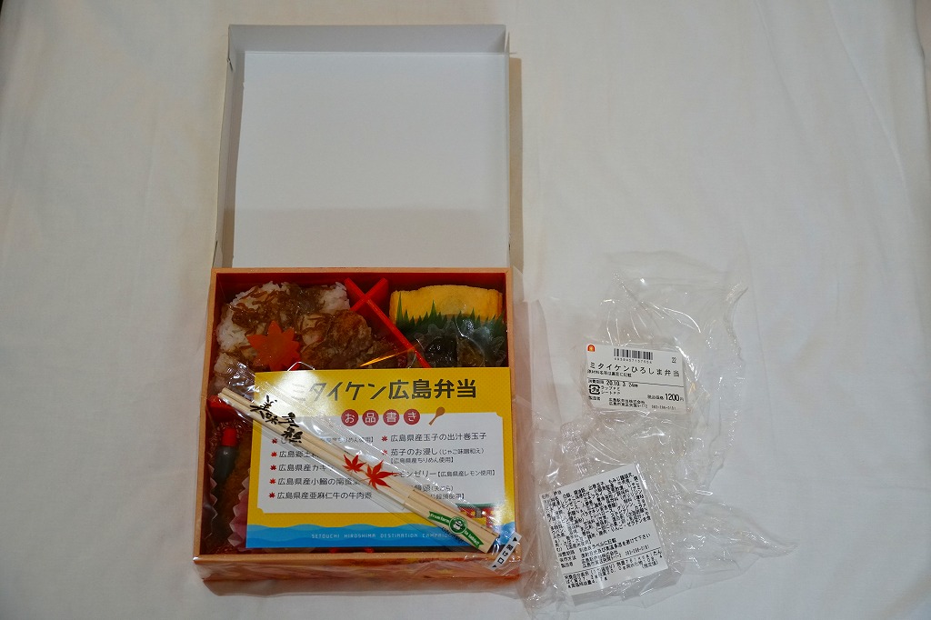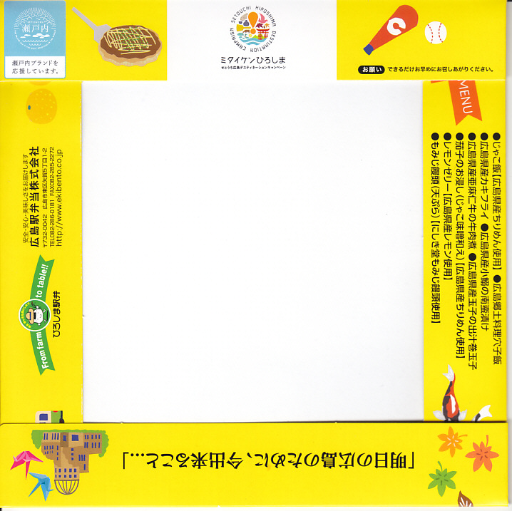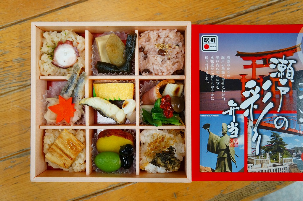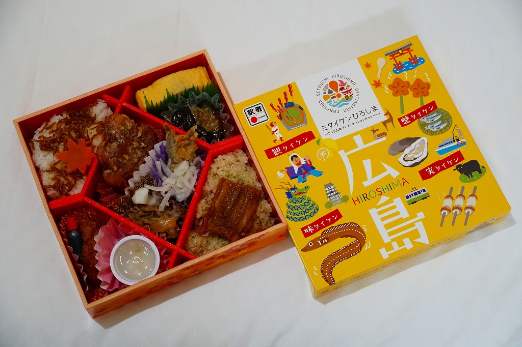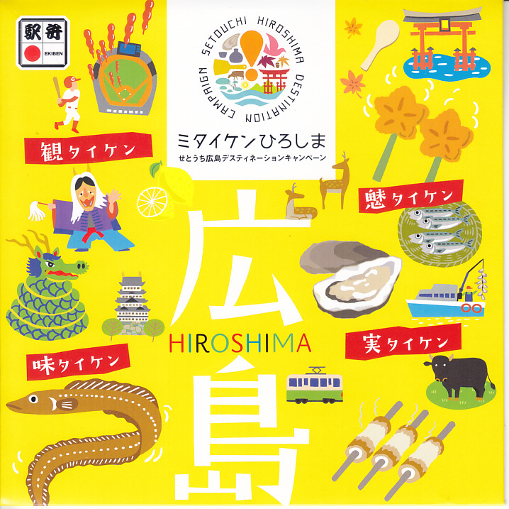 2020(令和2)年10月から12月までのJRグループの観光キャンペーン「ミタイケンひろしま(せとうち広島デスティネーションキャンペーン)」の会期に合わせて発売。ふたにそのロゴマークと、広島の名所や名物のイラストがちりばめられる。中身は周囲に穴子飯、ジャコ飯、カキフライとレモンゼリー、玉子焼とナスおひたしを配置し、中央に牛肉煮、イワシ南蛮漬、そしてなんと、もみじ饅頭の天ぷら。あんこの饅頭を揚げてしまうとは、食べた人の感想を聞いてみたいもの。会期の終了後も売られ、翌年8月頃に終売か。