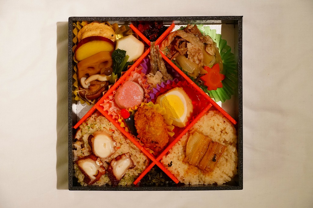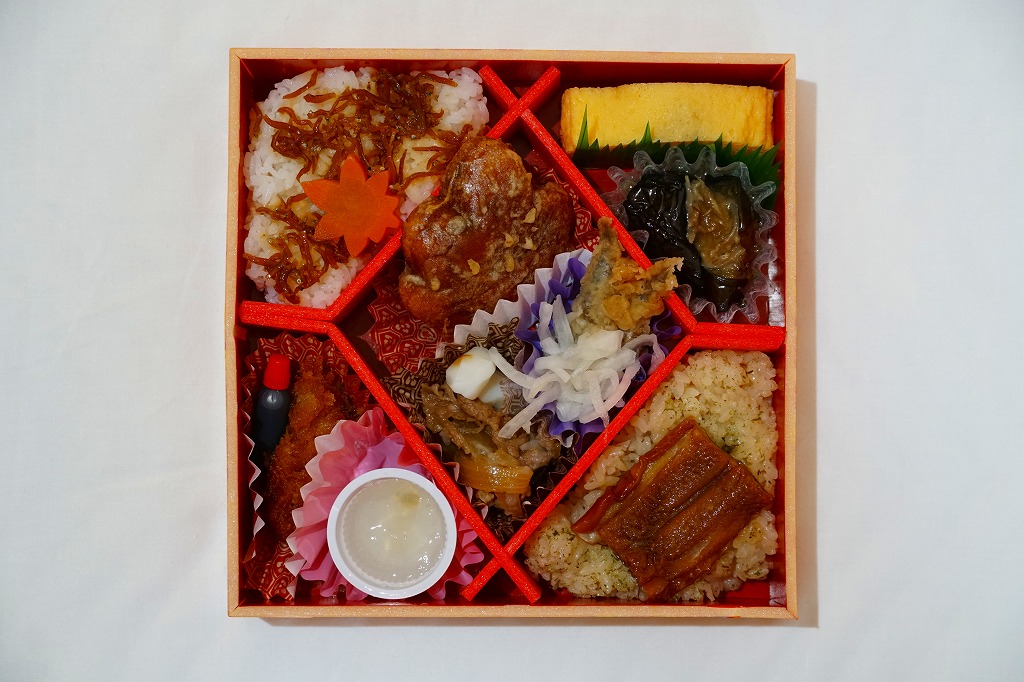 中身は「広島熟成どりの照り焼き」と玉子焼、「広島和牛のそぼろ飯」、「神石こんにゃく煮」とごぼうともみじ型にんじん、「郷土の味もぶり寿司」、「広島県産小いわし南蛮漬」ともみじ型かまぼこ、「郷土の味タコ飯」、「広島県産牡蠣フライ」とソース、「郷土の味あなご飯」、「広島県産柿羊羹」。