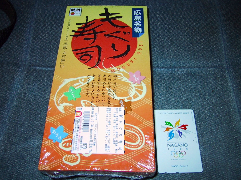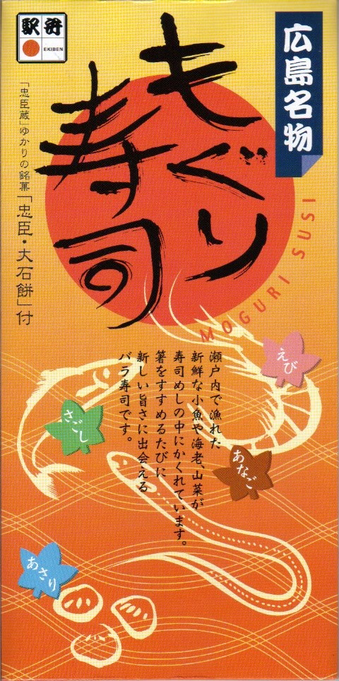 駅弁でのもぐり寿司といえば、山陰本線松江駅「大和しじみのもぐり寿司」が有名で、広島にももぐり寿司があるとは思わなかった。価格は2001年の購入時で870円、2015年時点で905円、2017年時点で880円。2018年頃までの販売か。2021年に1,080円でリニューアル再発売したものの、同年で終売か。