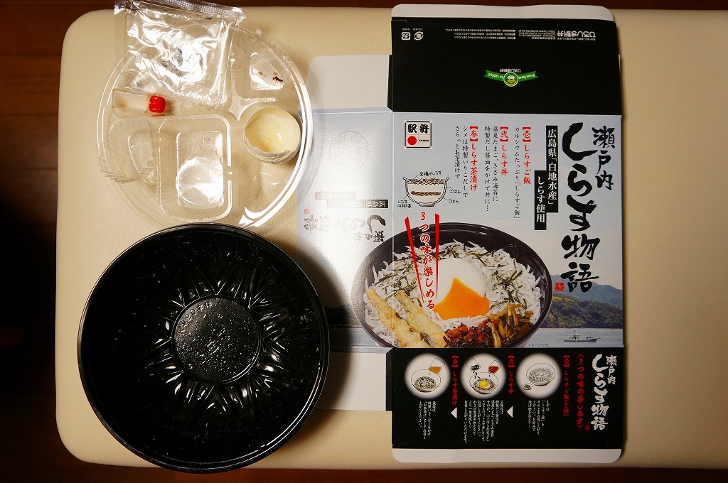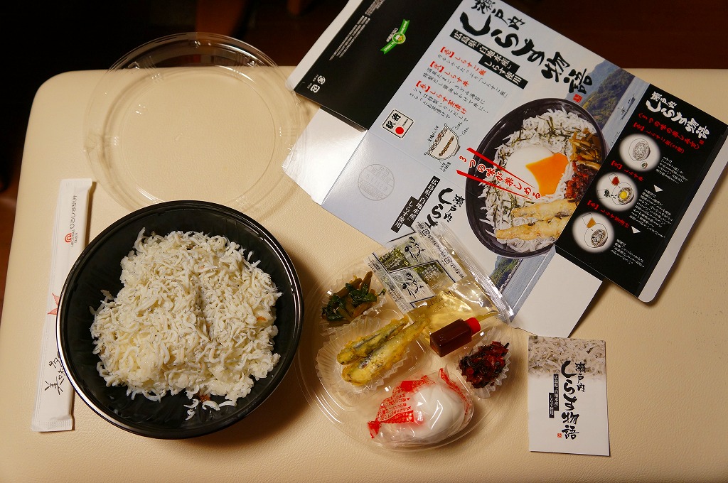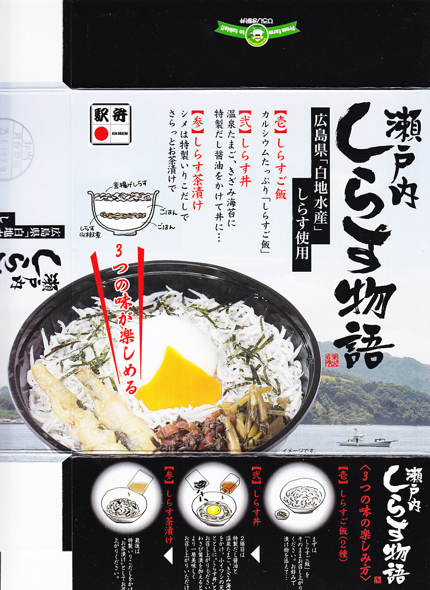 2013(平成25)年1月の京王百貨店の駅弁大会での実演販売で発売か。丼で、シラス山椒煮を仕込んだ白御飯を釜揚げシラスで覆い、だし汁、だし醤油、小イワシの天ぷら、温泉卵、柴漬け、ワサビ菜漬を添付する。名古屋のひつまぶしのように、最初はそのままシラス御飯、次に醤油とワサビ菜でシラス丼、最後にだし汁でしらす茶漬けと、3種の味を楽しめとパッケージに書いてあるエンターテイメント駅弁。面倒だけど楽しくもある。2〜3月には現地での販売もされたようだが、定着しなかった模様。