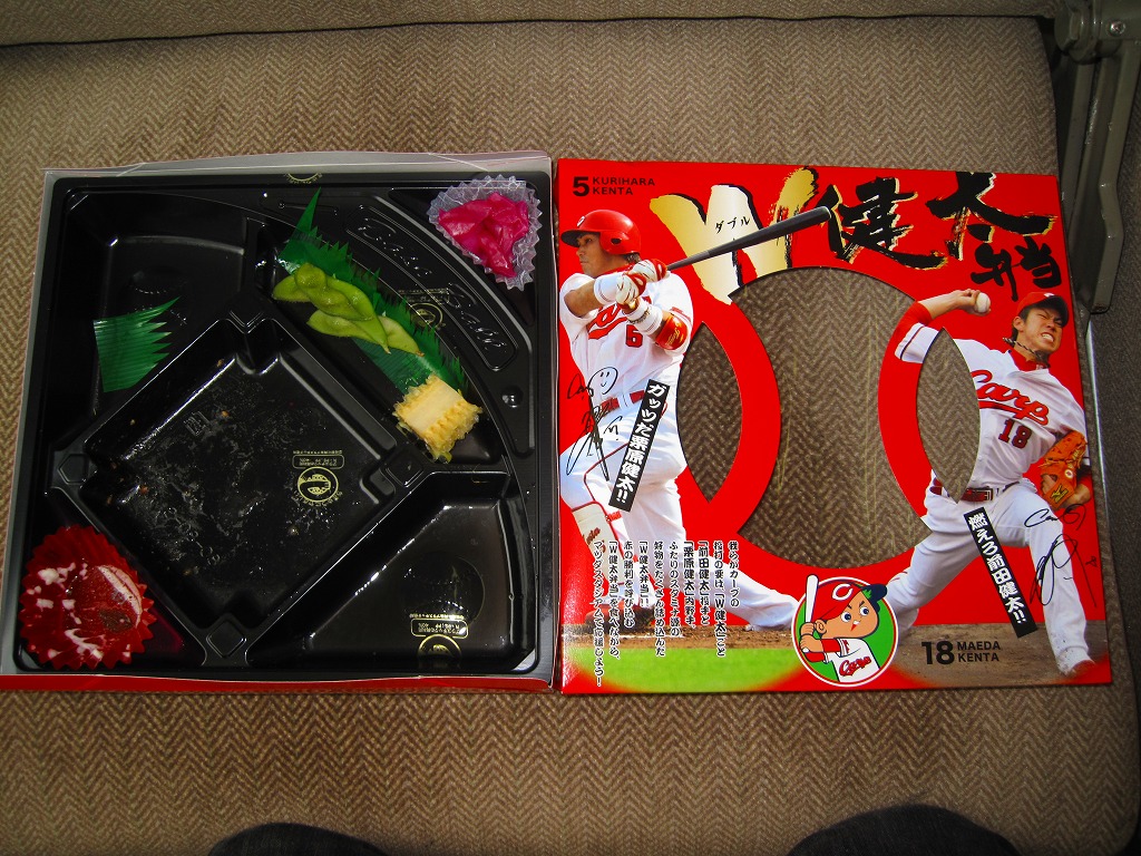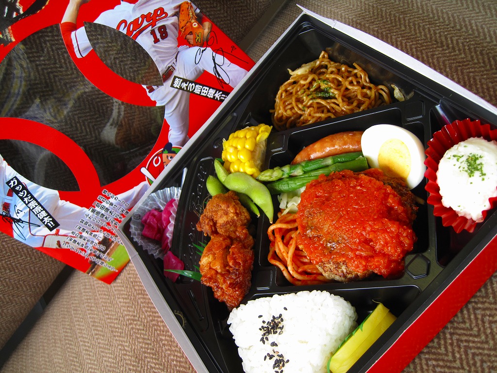 2009(平成21)年3月19日に発売し、2010年版もこのように無事に発売された、プロ野球の選手にちなんだお弁当。広島東洋カープの前田健太投手と栗原健太内野手の写真を掲載した赤く大きな専用紙箱を使用、黒いスタジアム型トレーに収まる中身は、三角形の型押し飯、焼きそば、ハンバーグ、鶏唐揚、スパゲティ、ウインナー、枝豆、とうもろこし、ゆで卵、ポテトサラダ、紫キャベツの酢の物、たくあんなど。