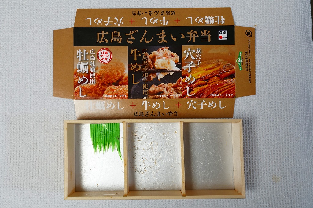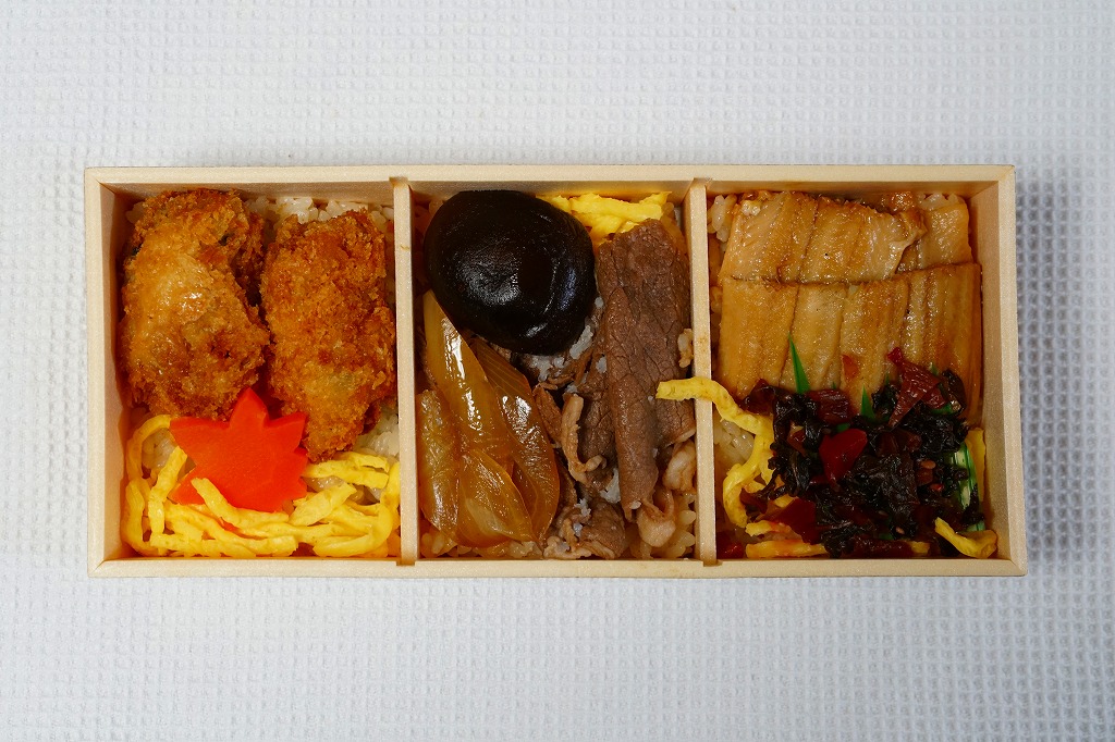 秋冬の駅弁大会シーズンに向けた、2014(平成26)年秋の新商品か。ふたに「牡蠣めし」「牛めし」「穴子めし」と書かれるとおり、横に細長い容器の3区画に、かき飯をカキフライ2個で覆い錦糸卵とニンジンを添える牡蠣めし、茶飯を牛すき焼きとシイタケと錦糸卵で覆う牛めし、茶飯を煮穴子と錦糸卵と広島菜漬けで覆う穴子めしが入っていた。1食分で3食を楽しめる、便利な駅弁。2019年の終売か。