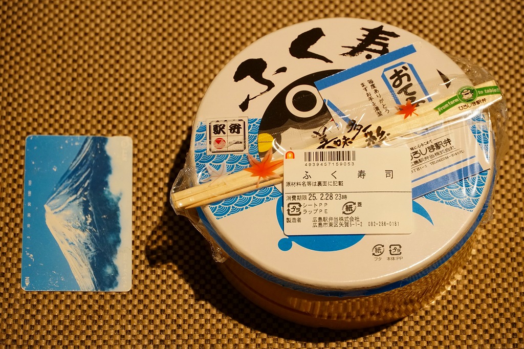 1989(平成元)年に下関駅などで発売し、現地や催事で名物だった下関駅弁「ふく寿司」。2010(平成22)年の駅弁屋の廃業により新山口駅の駅弁屋に引き継がれ、その駅弁屋も2015(平成27)年に廃業したためさらに広島駅の駅弁屋に引き継がれた。その頃はスーパーやデパートの催事では下関駅や新山口駅の駅弁として売られたが、2020年代には広島駅の駅弁と紹介されるようになったと思う。