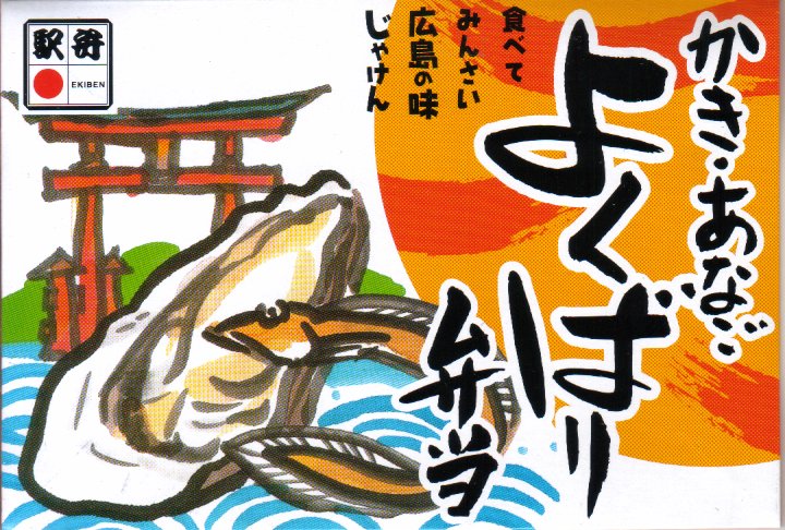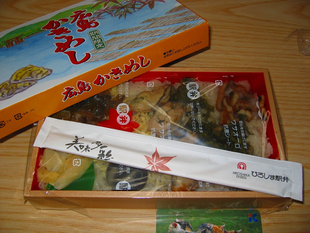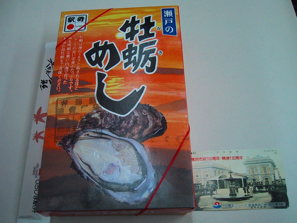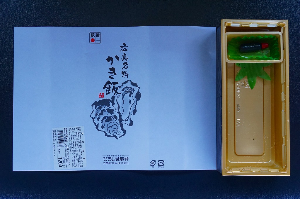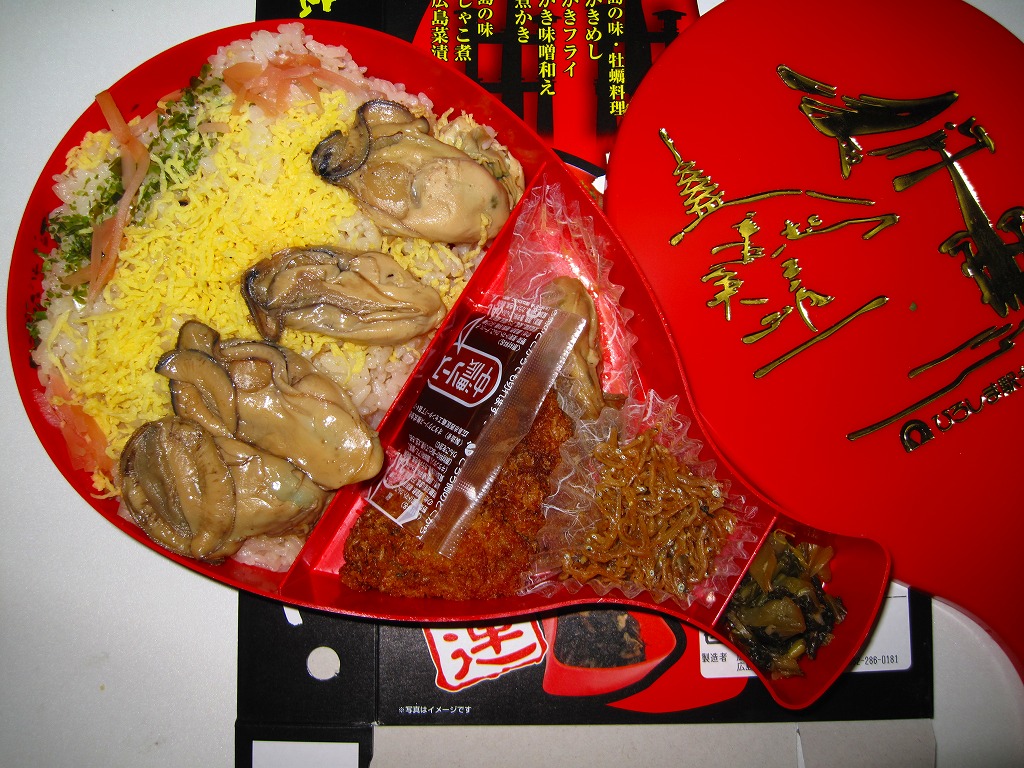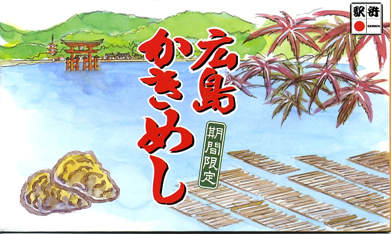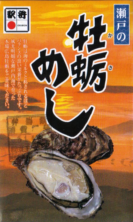 広島駅で名物のカキ駅弁の、おそらく最も廉価なパッケージ。小さく浅い長方形の容器に、宮島やカキいかだを描いたボール紙のふたをかけてラップで包む。中身は茶飯の上にカキや広島菜漬やワカメなどが載ったかきめし。まさに海のミルクという感じの煮カキ4個は美味いが、カキを感じるのはそこだけで、あとは飯も具も無味無臭。現地ではあと210円追加して1,050円のカキ駅弁を買うのが良いと思う。2014年時点で現存しない模様。