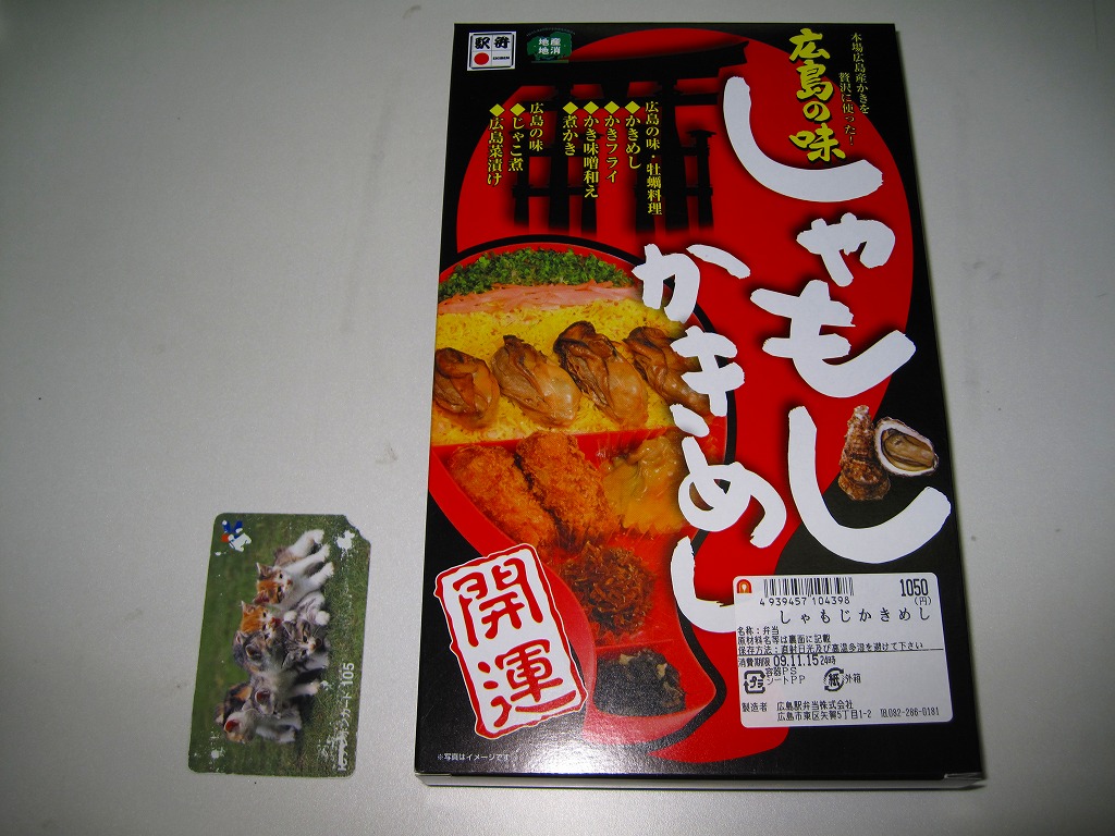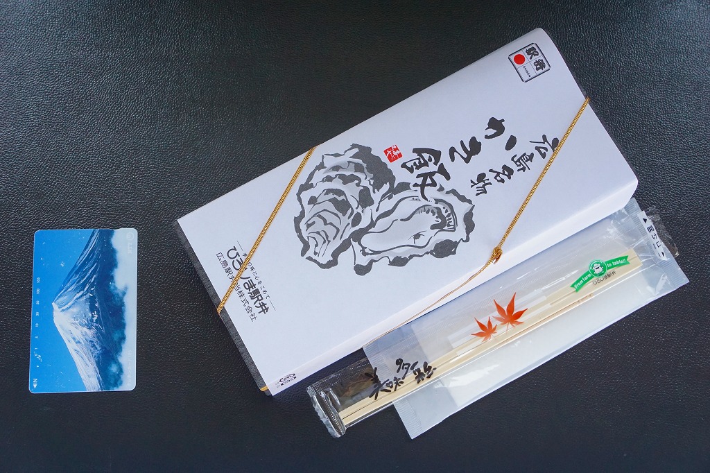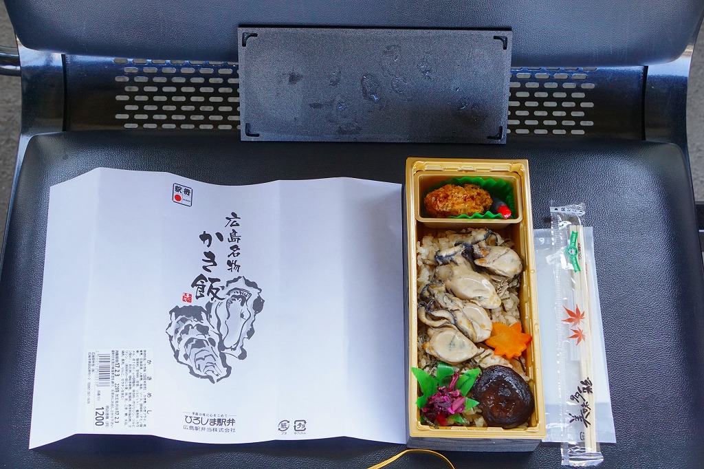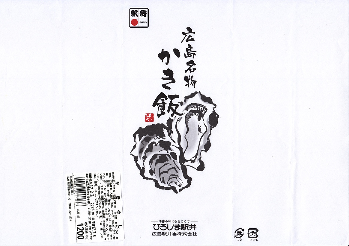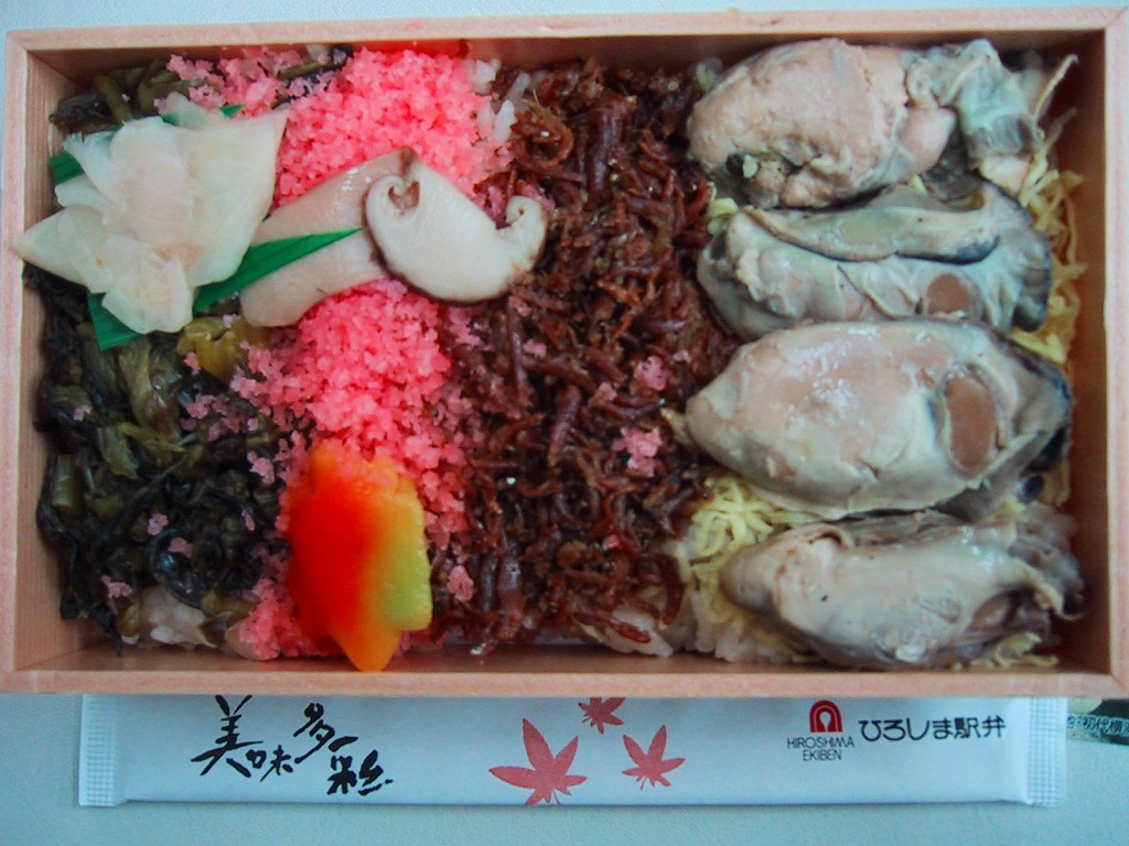 広島駅で名物のカキ駅弁の、おそらく最も廉価なパッケージ。小さく浅い長方形の容器に、宮島やカキいかだを描いたボール紙のふたをかけてラップで包む。中身は茶飯の上にカキや広島菜漬やワカメなどが載ったかきめし。まさに海のミルクという感じの煮カキ4個は美味いが、カキを感じるのはそこだけで、あとは飯も具も無味無臭。現地ではあと210円追加して1,050円のカキ駅弁を買うのが良いと思う。2014年時点で現存しない模様。