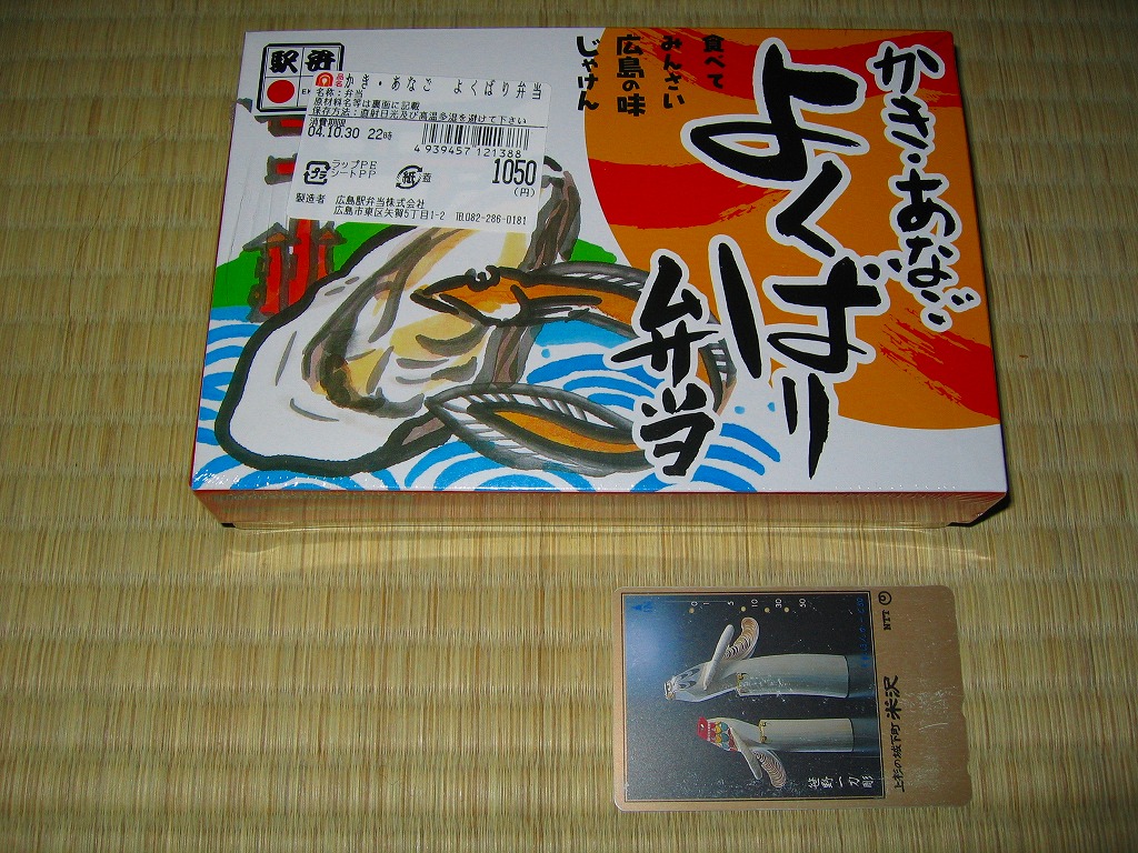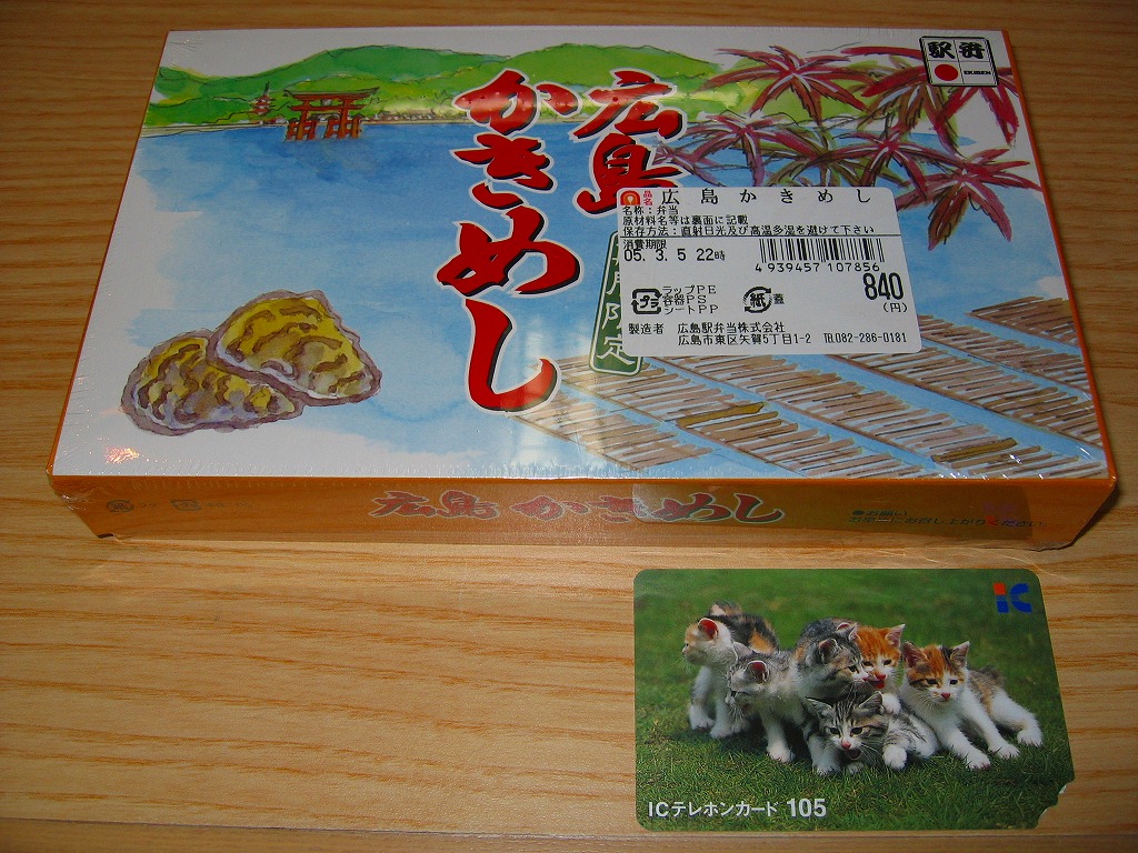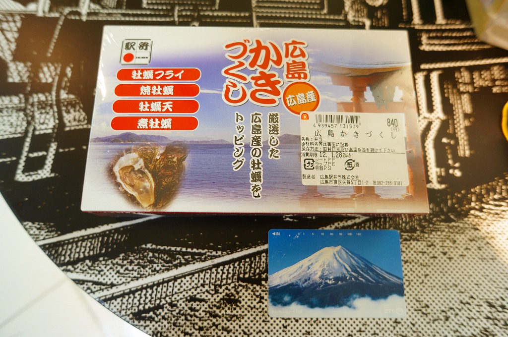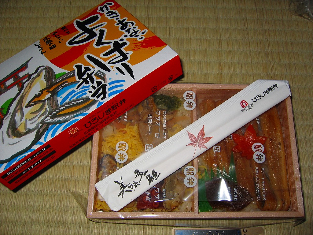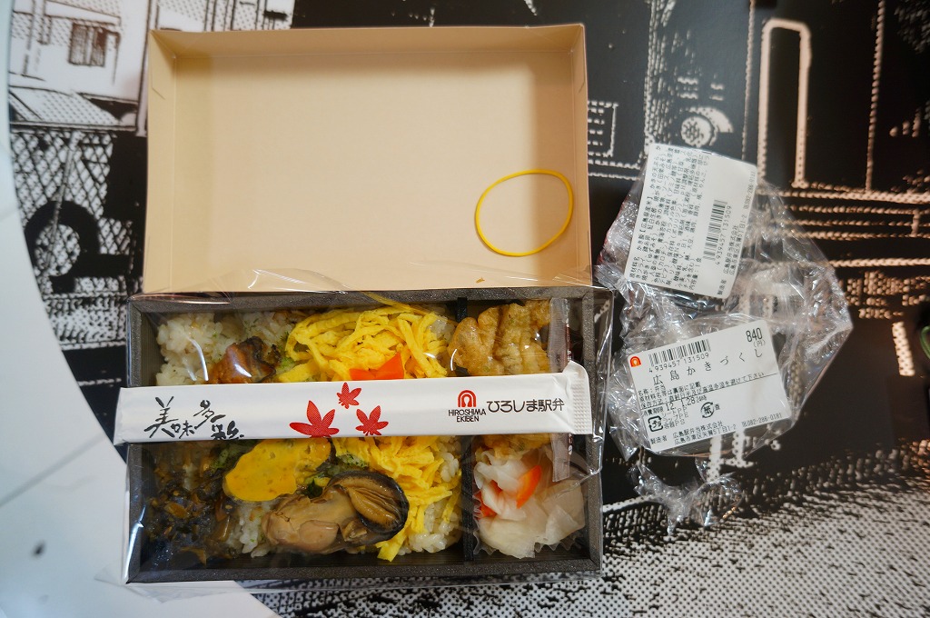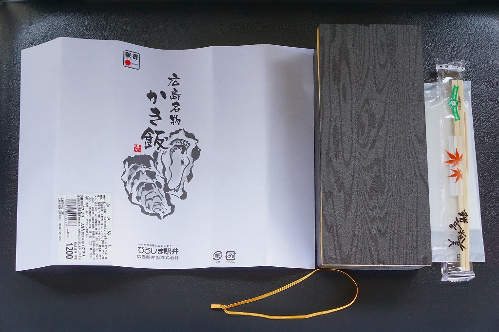 広島駅で名物のカキ駅弁の、おそらく最も廉価なパッケージ。小さく浅い長方形の容器に、宮島やカキいかだを描いたボール紙のふたをかけてラップで包む。中身は茶飯の上にカキや広島菜漬やワカメなどが載ったかきめし。まさに海のミルクという感じの煮カキ4個は美味いが、カキを感じるのはそこだけで、あとは飯も具も無味無臭。現地ではあと210円追加して1,050円のカキ駅弁を買うのが良いと思う。2014年時点で現存しない模様。