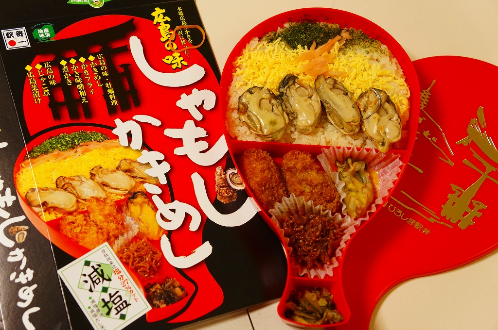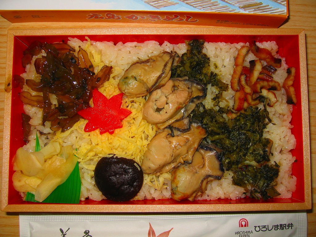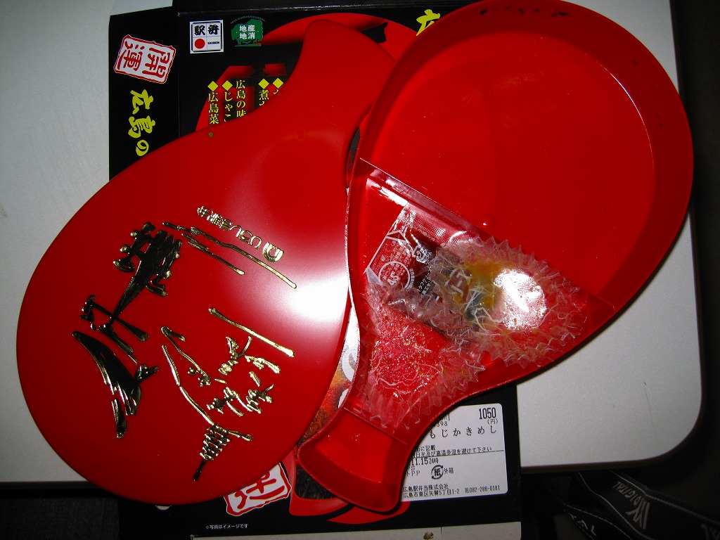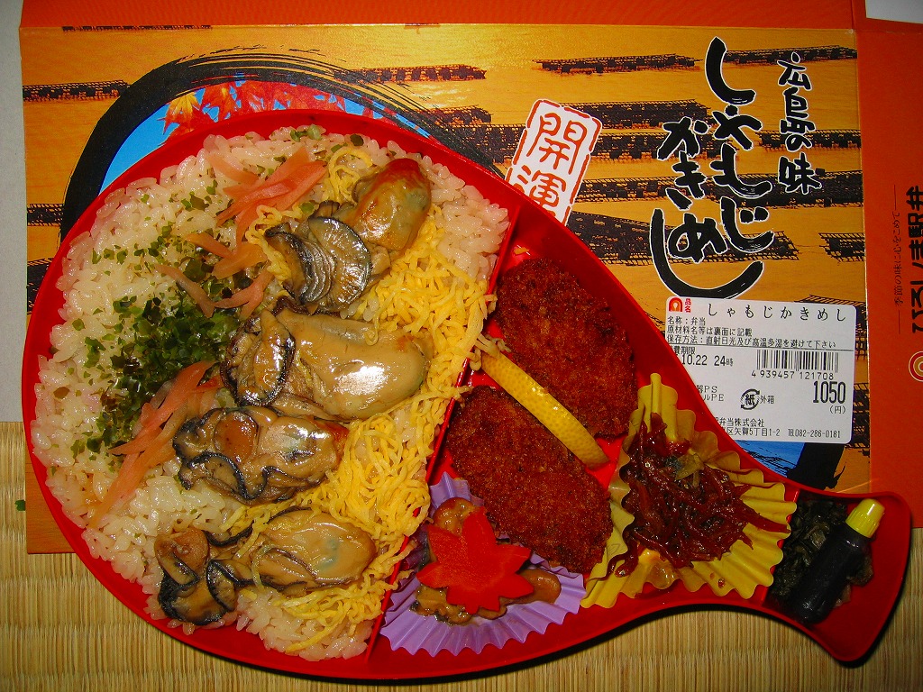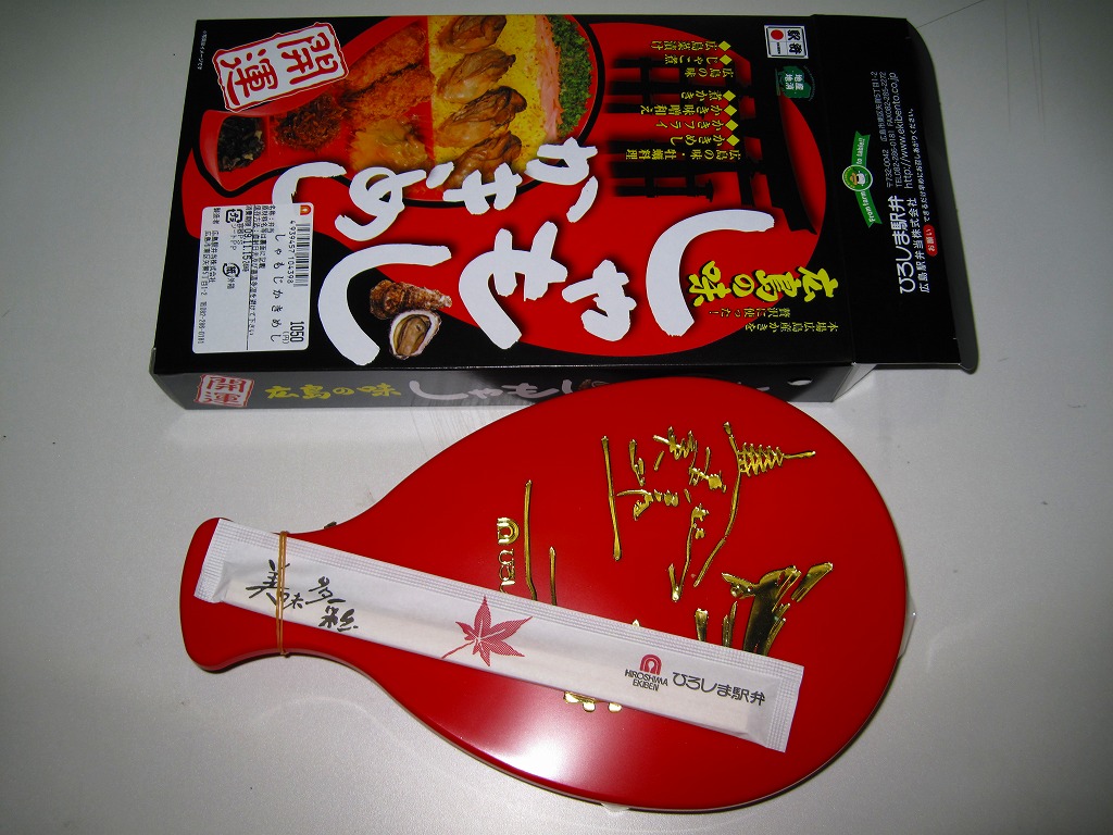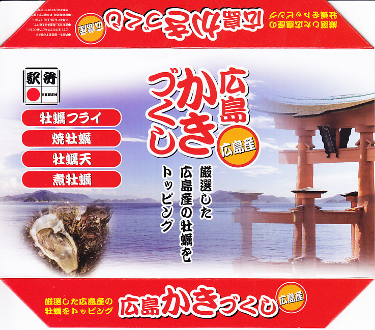 1968(昭和43)年に発売か。この駅弁のためだけに作られている、しゃもじ型の赤いプラスティック製容器を使用、これを中身の写真や商品名を大きく書いて、宮島の大鳥居のシルエットを描いたボール紙の箱に詰める。中身はカキ飯だし汁で炊いた御飯の上を錦糸卵、紅生姜、青のりで覆ったうえで煮カキを4個置き、カキフライ2個、カキの味噌和え、じゃこ煮、広島菜漬を添えるもの。10月頃から3月頃までの冬季限定発売。