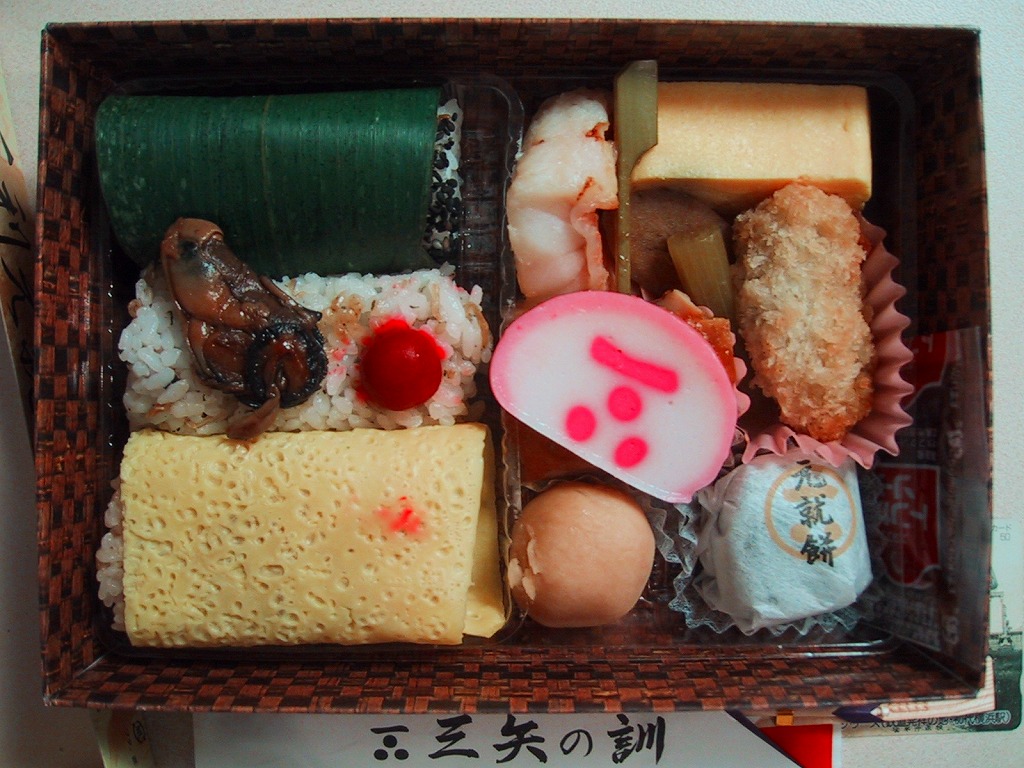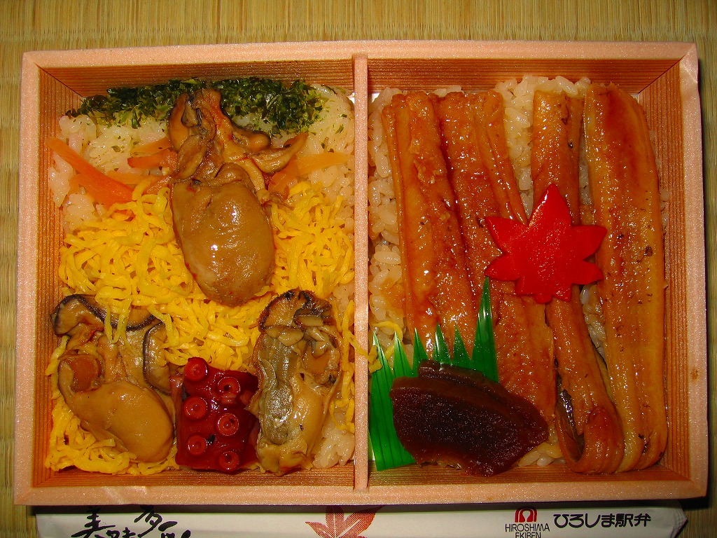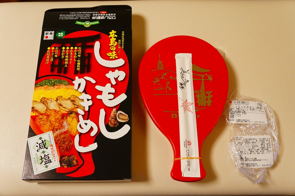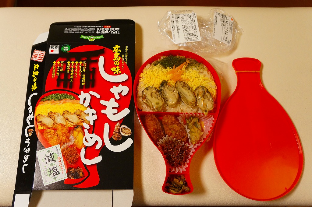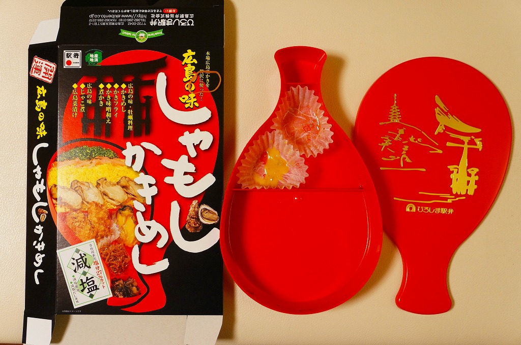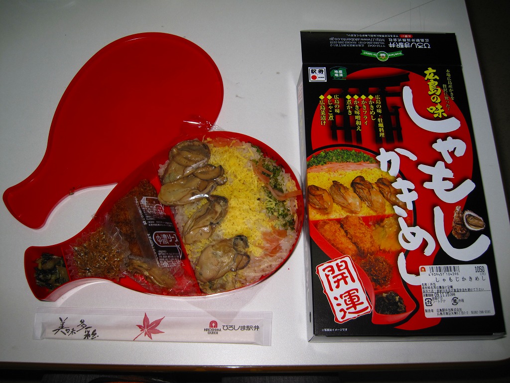1968(昭和43)年に発売か。この駅弁のためだけに作られている、しゃもじ型の赤いプラスティック製容器を使用、これを中身の写真や商品名を大きく書いて、宮島の大鳥居のシルエットを描いたボール紙の箱に詰める。中身はカキ飯だし汁で炊いた御飯の上を錦糸卵、紅生姜、青のりで覆ったうえで煮カキを4個置き、カキフライ2個、カキの味噌和え、じゃこ煮、広島菜漬を添えるもの。10月頃から3月頃までの冬季限定発売。