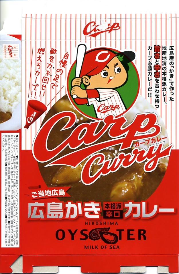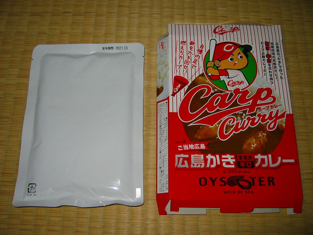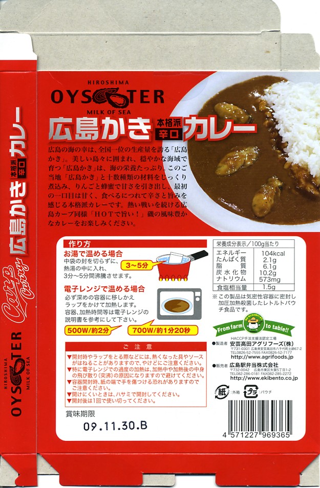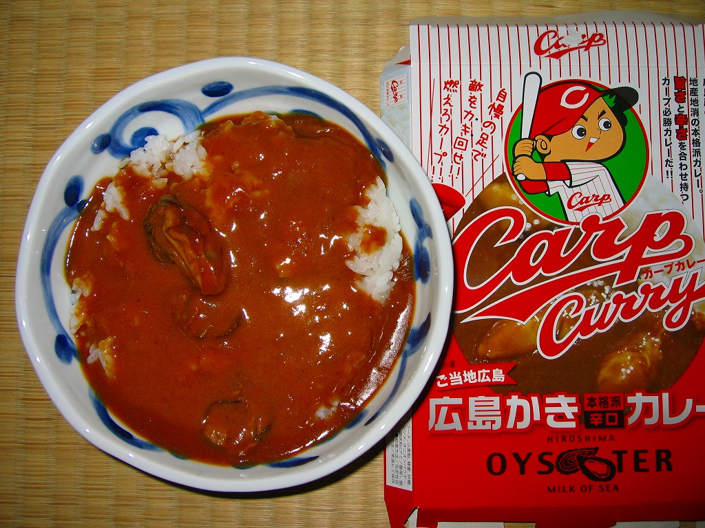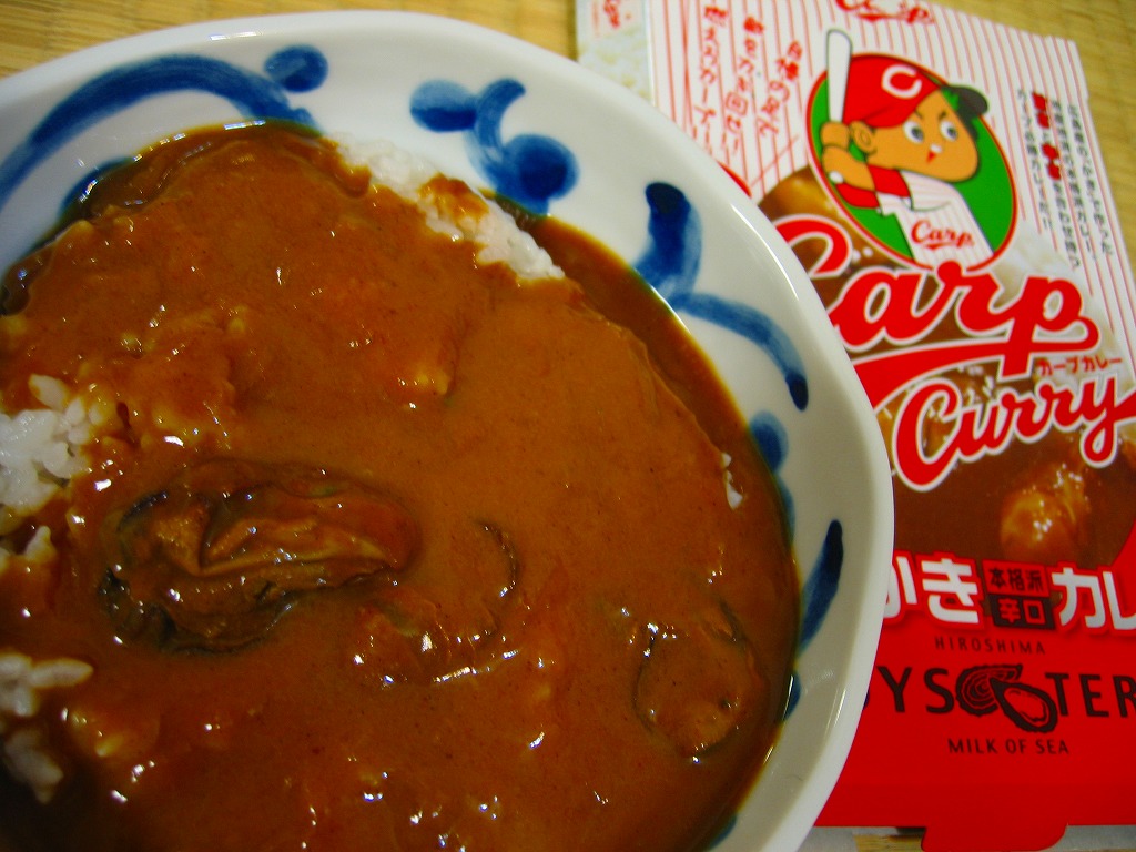 2008(平成20)年7月1日に「ご当地広島幻霜ポーク本格派辛口カレー」とともに発売。名前のとおりカキ入りカレー、というより具にカキしか入っていないレトルトカレー。辛口と香辛料に負けたのか、駅弁のようにカキの風味や磯の臭みは感じられず、カキの身も小さく固かった。これは駅弁ではなく、製造者も駅弁屋ではない安芸高田アグリフーズだが、販売者は広島駅弁当であり、駅弁大会で駅弁とともに販売していたため、ここに収蔵した。