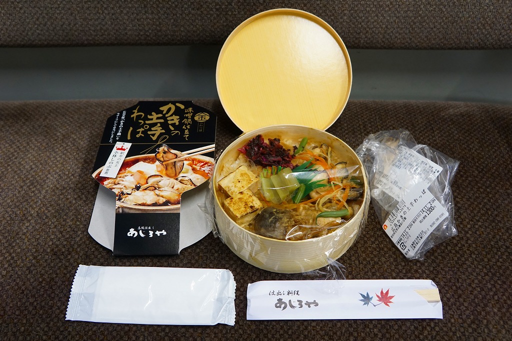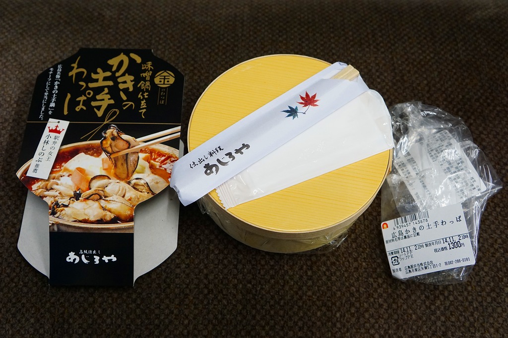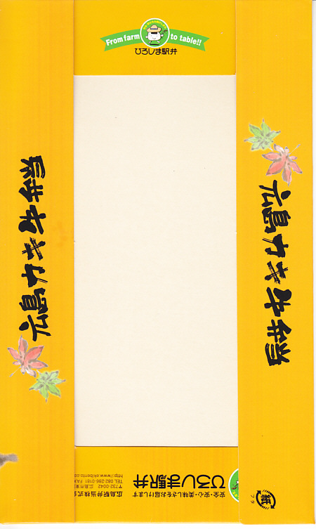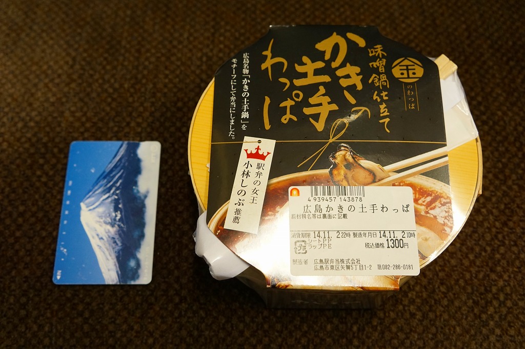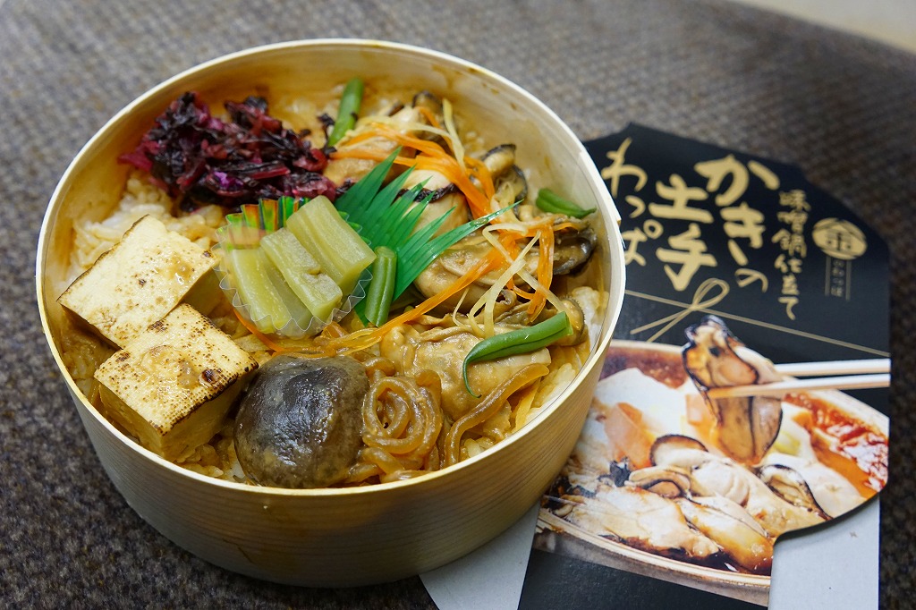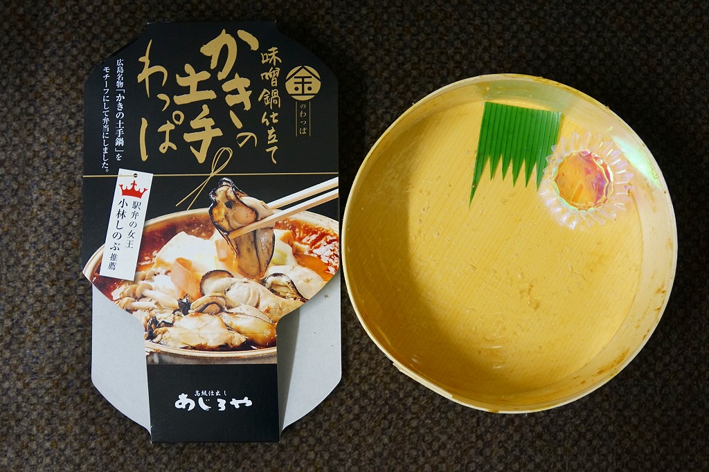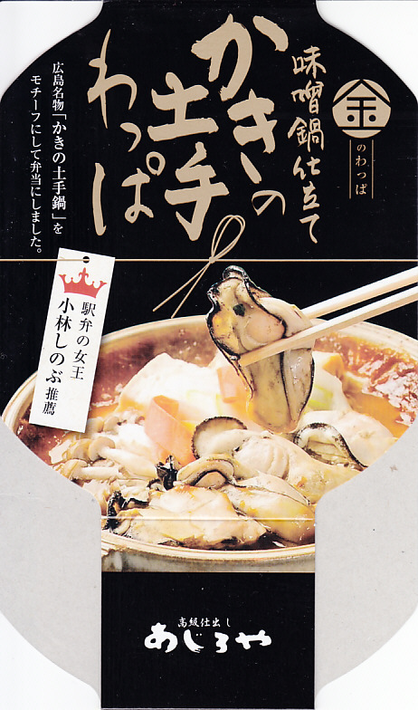 2014(平成26)年夏の新商品か。広島名物「かきの土手鍋」をモチーフにして弁当にしたこと、駅弁の女王・小林しのぶさんが推薦したことが、スリーブに記される。中身は御飯を味噌仕立てえ煮込んだカキ、とうふ、しいたけ、糸こんにゃくなどで覆い、フキと柴漬けを添えたもの。まるでカキのすき焼き丼。販売年度は秋から冬まで売られ、以後は冬の広島駅や東京駅で時々売られる模様。2019年までの販売か。