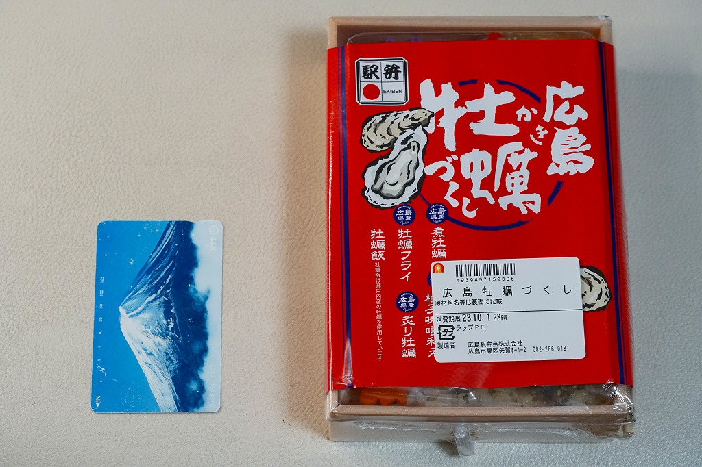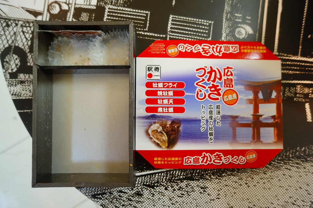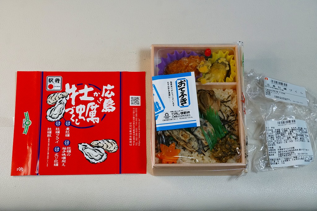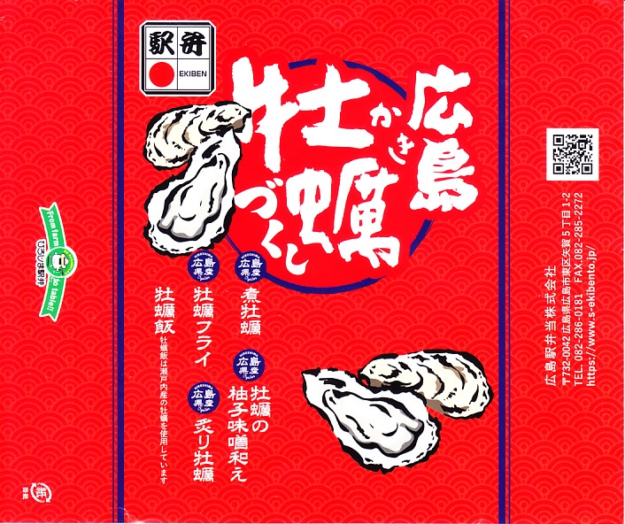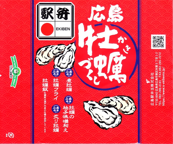 2023(令和5)年10月1日に広島駅や東京駅などで発売か。同日からのJR東日本の駅弁キャンペーン「駅弁味の陣2023」にエントリー。一昔前の広島駅弁「広島かきづくし」との関連はないと思う。やや小柄な長方形のプラ容器を、殻付き牡蠣を描いて商品名と中身を記した、広島のプロ野球団を思わせる真っ赤な掛紙で包む。
