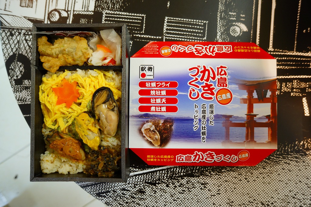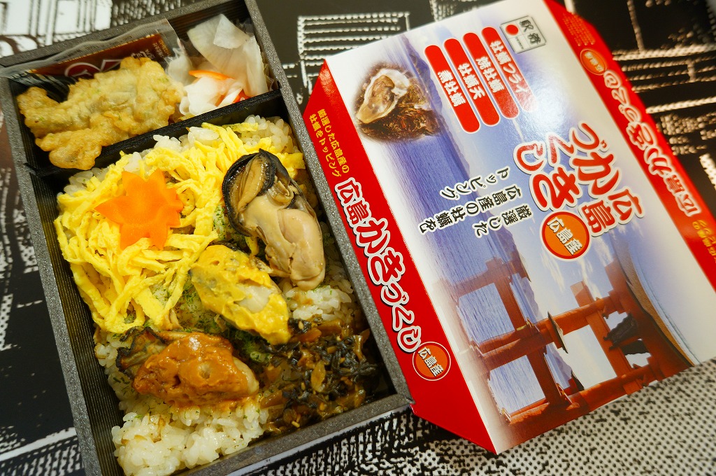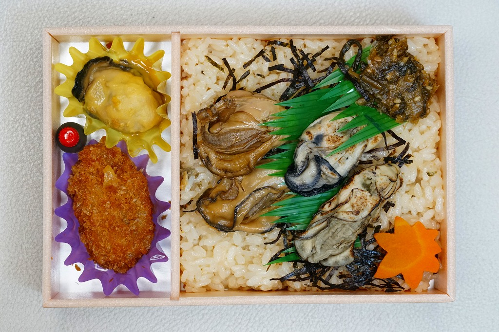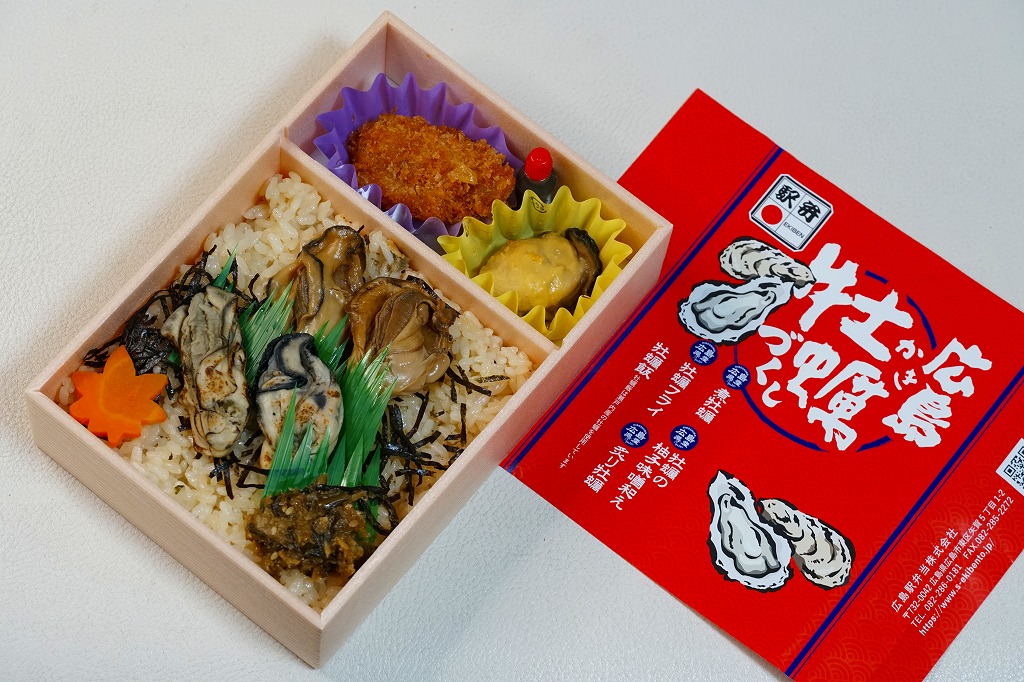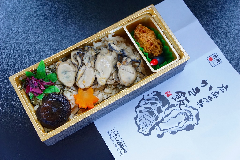 冬季限定の駅弁として、2014(平成26)年までに発売か。カキ飯にカキ煮4個を並べ、カキフライ、しいたけ、にんじん、柴漬けを添える。広島駅の名物駅弁「しゃもじかきめし」に比べて、容器も中身もシンプルなカキ駅弁。丸く大きくふっくらしたカキの味と香りが楽しめるのは、さすが「しゃもじかきめし」の調製元。こちらのほうが惣菜風に近代的な印象を受けた。2018(平成30)年までの販売か。