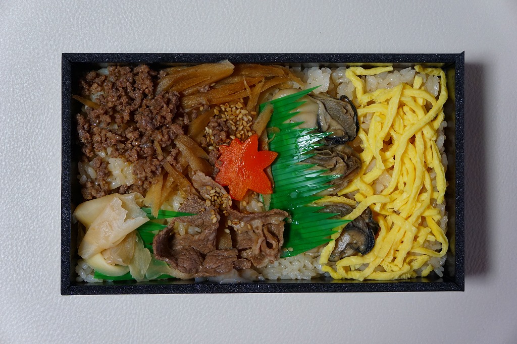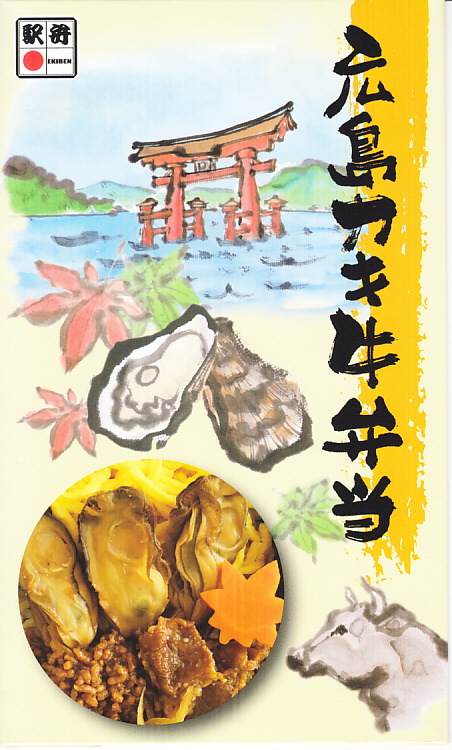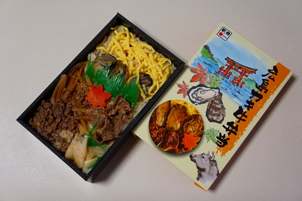 2015(平成27)年の8月までに、東京駅の駅弁売店「駅弁屋 祭」で発売か。駅売り弁当としては駅弁であり、広島駅で売られない点では疑義駅弁。パッケージのふたには、中身の一部の写真に、カキと牛と宮島の厳島神社の鳥居を描く。中身は茶飯を錦糸卵、カキ煮3個、牛すき焼き、牛そぼろで覆い、ニンジンと甘酢生姜を添えるもの。味は確かだが、こんなに高額なのに内容が薄く、同じ価格でこの年は9月20日の発売という「しゃもじかきめし」が恋しくなる。どうも現地で売られることなく、2か月ほどで売り止めた模様。