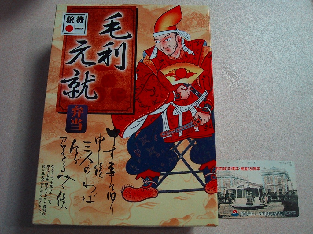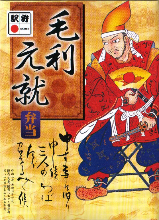 1997(平成9)年のNHK大河ドラマ「毛利元就」の放送に合わせて発売か。竹籠の目を印刷したボール紙の容器に、毛利元就を描いたボール紙のふたをする。トレーに入った中身は、元就が好んだ山海の味わいを再現したそうで、塩飯玉子巻・じゃこ飯カキ添え・しそ飯笹巻の3種の俵型おむすびに、川魚甘露煮や山賊焼などを添えている。デザートは元就餅。割りばし一膳2本に楊枝で三矢の訓とし、その箸袋に蒲鉾と元就餅にマークが入る、手の込んだ駅弁。大河ドラマの放映が終了しても販売を続けたが、現在は売られていない模様。