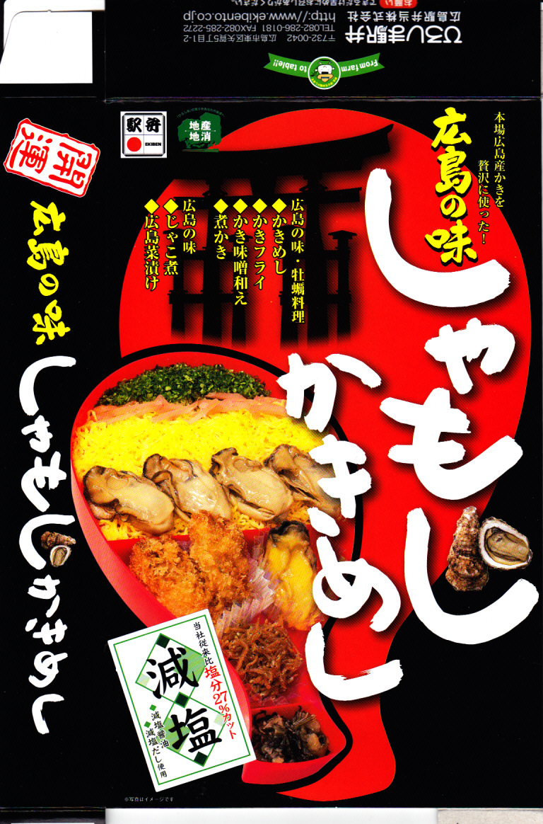 秋冬の駅弁大会シーズンに向けた、2010(平成22)年秋の新商品か。価格や容器や内容からみて、下記の駅弁「広島かきめし」の後継作で、事実上の駅弁大会専用商品か。比較的小柄な長方形の容器に、宮島やカキの写真を印刷したボール紙で直接ふたをする。中身は御飯の上に煮カキ、田楽味噌の焼カキ、柚子味噌の焼カキを並べ、広島菜や玉子焼で残りを覆い、カキ天とカキフライ、ダイコンとニンジンの酢の物を添えるもの。カキ以外におかずがないため、御飯をもて余す感じ。味は良好も、「しゃもじかきめし」でなくこちらを選ぶ理由は見当たらない。2014年時点で現存しない模様。