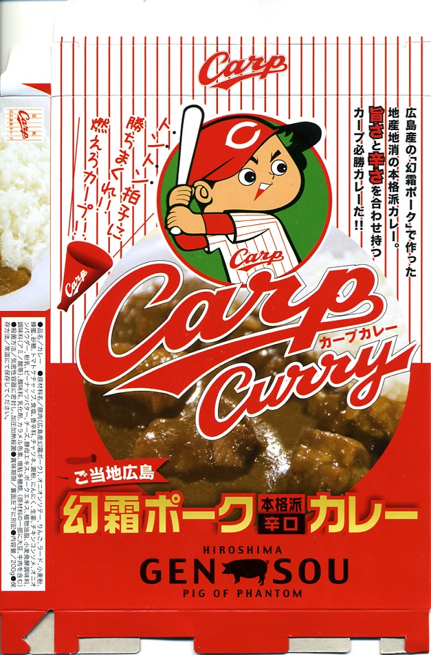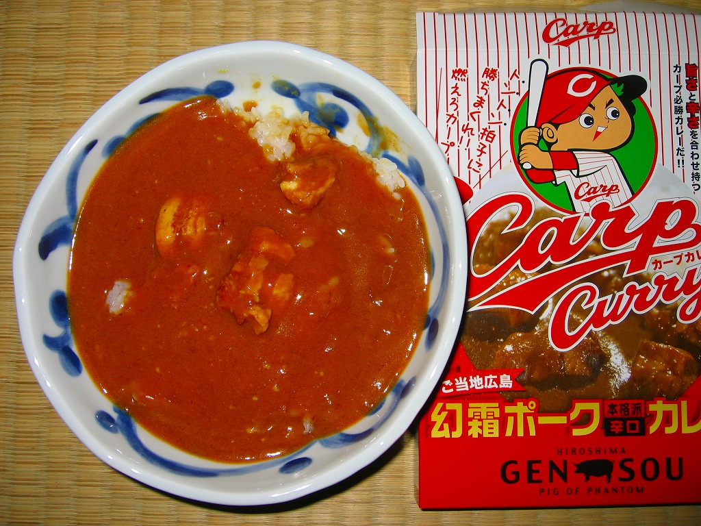 内容量は200グラム。豚肉の分量が寂しいが、レトルトカレーで見本写真ほど肉が入っているはずはない。風味はなんとなく価格相応、カープファンならパッケージで買っておきたい応援商品。売れ行きが良かったのか、2009年のペナントレースと広島市民球場の移転新築に合わせて、新たなパッケージデザインで再登場している。「ご当地広島かき本格派辛口カレー」も存在。