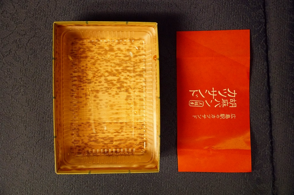 広島駅の駅ビルで買えたサンドイッチ。「広島駅限定」を名乗るため、駅弁と同列で収蔵した。駅弁でもよく使われる竹皮柄の紙箱に、「広島駅のカツサンド」とも記した赤い掛紙を巻く。透明なトレーに収まる中身は、商品名のとおり、トンカツのソース漬けと千切りキャベツを胡麻パンで挟んだ、カツサンドが3切れ。パンの個性が風味を彩る。調製元は広島エリアで様々な飲食店を経営する企業。